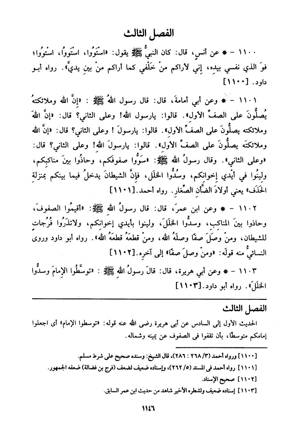 1100 - عن أنس، قال: كان النبي صلى الله عليه وسلم يقول: ((استووا، استووا، استووا؛ فو الذي نفسي بيده، إني لأراكم من خلفي كما أراكم من بين يدي)). رواه أبو داود. [1100]