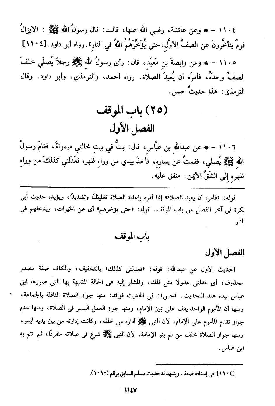 1105 - وعن وابصة بن معبد، قال: رأي رسول الله صلى الله عليه وسلم رجلاً يصلي خلف الصف وحده، فأمره أن يعيد الصلاة. رواه أحمد، والترمذي، وأبو داود. وقال الترمذي: هذا حديث حسن.