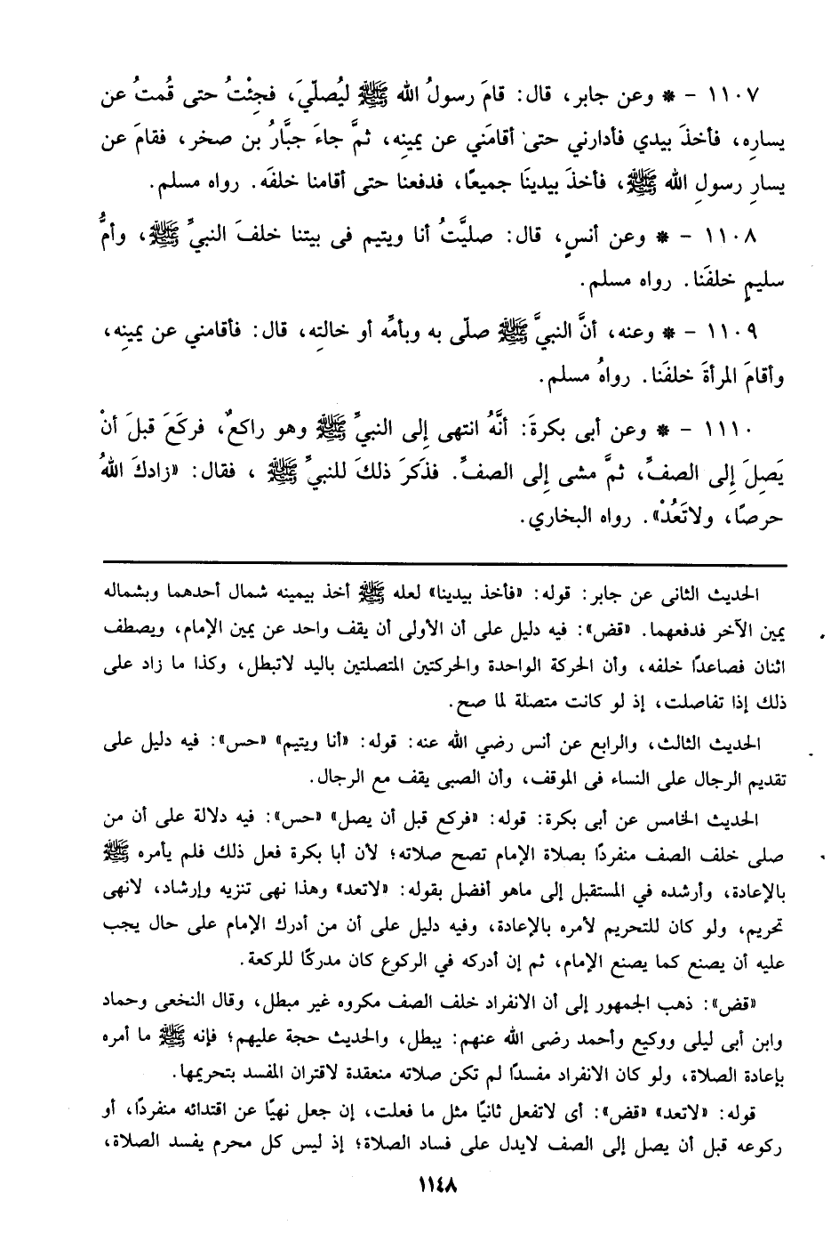 1107 - وعن جابر، قال: قام رسول الله صلى الله عليه وسلم ليصلي، فجئت حتى قمت عن يساره، فأخذ بيدي فأدارني حتى أقامني عن يمينه، ثم جاء جبار بن صخر، فقام عن يسار رسول الله صلى الله عليه وسلم، فأخذ بيدينا جميعاً، فدفعنا حتى أقامنا خلفه. رواه مسلم.