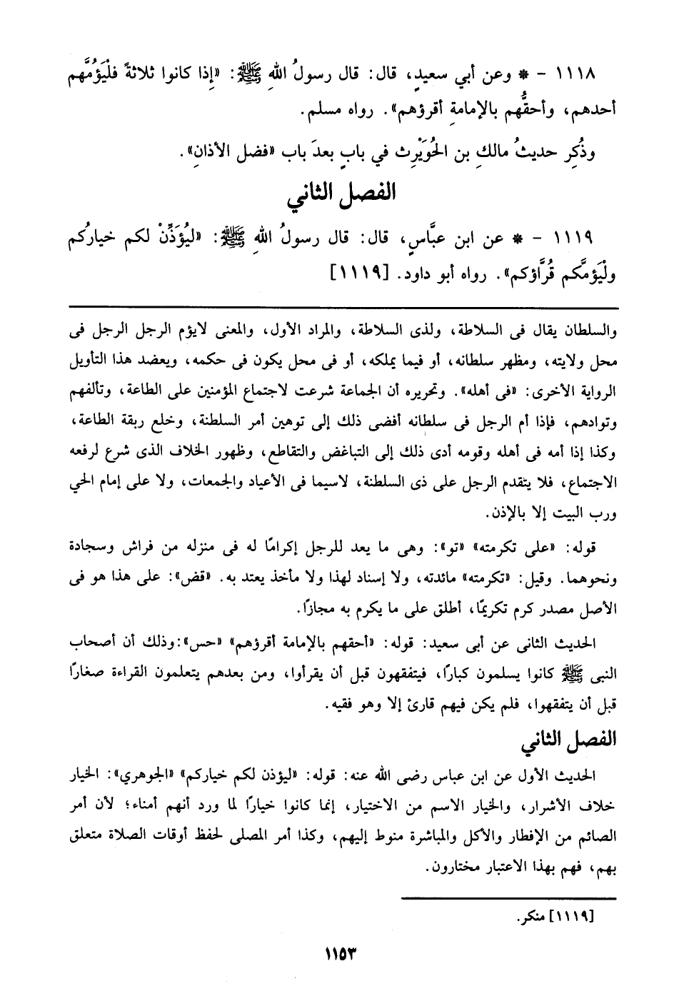 والسلطان يقال في السلاطة، ولذي السلاطة، والمراد الأول، والمعنى لا يؤم الرجل الرجل في محل ولايته، ومظهر سلطانه، أو فيما يملكه، أو في محل يكون في حكمه، ويعضد هذا التأويل الرواية الأخرى: ((في أهله)). وتحريره أن الجماعة شرعت لاجتماع المؤمنين علي الطاعة، وتألفهم وتوادهم، فإذا أم الرجل في سلطانه أفضى ذلك إلي توهين أمر السلطنة، وخلع ربقة الطاعة، وكذا إذا أمه في أهله وقومه أدى ذلك إلي التباغض والتقاطع، وظهور الخلاف الذي شرع لرفعه الاجتماع، فلا يتقدم الرجل علي ذي السلطنة، لاسيما في الأعياد والجمعات، ولا علي إمام الحي ورب البيت إلا بإذن.