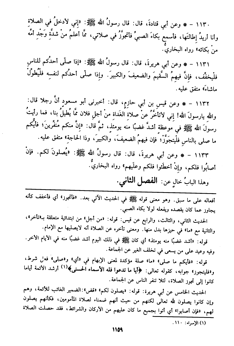 1130 - وعن أبي قتادة، قال: قال رسول الله صلى الله عليه وسلم: ((إني لأدخل في الصلاة وأنا أريد إطالتها، فأسمع بكاء الصبي فأتجوز في صلاتي، مما أعلم من شدة وجد أمه من بكائه)) رواه البخاري.