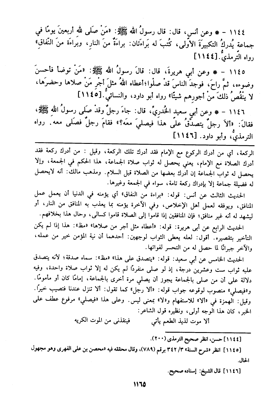 1144 - وعن أنس، قال: قال رسول الله صلى الله عليه وسلم: ((من صلي لله أربعين يوماً في جماعة يدرك التكبيرة الأولي، كتب له براءتان: براءة من النار، وبراءة من النفاق)) رواه الترمذي. [1144]