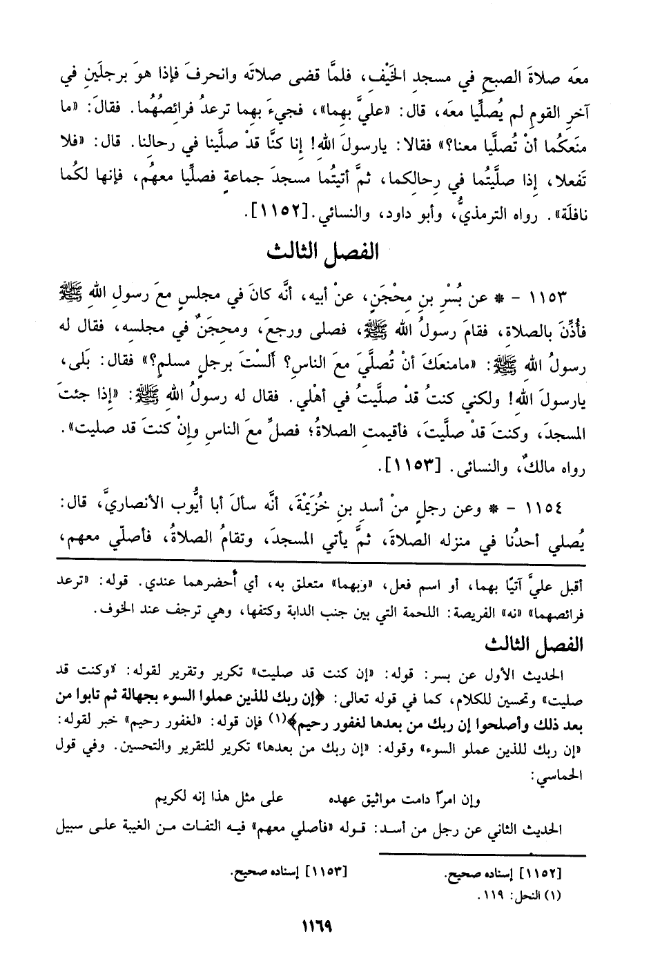 الحديث الأول عن بسر: قوله: ((إن كنت قد صليت)) تكرير وتقرير لقوله: ((وكنت قد صليت)) وتحسين للكلام، كما في قوله تعالي: {إن ربك للذين عملوا السوء بجهالة ثم تابوا من بعد ذلك وأصلحوا إن ربك من بعدها لغفور رحيمْ فإن قوله: ((لغفور رحيم)) خبر لقوله: ((إن ربك للذين عملوا السوء)) وقوله: ((إن ربك من بعدها)) تكرير للتقرير والتحسين. وفي قول الحماسي: