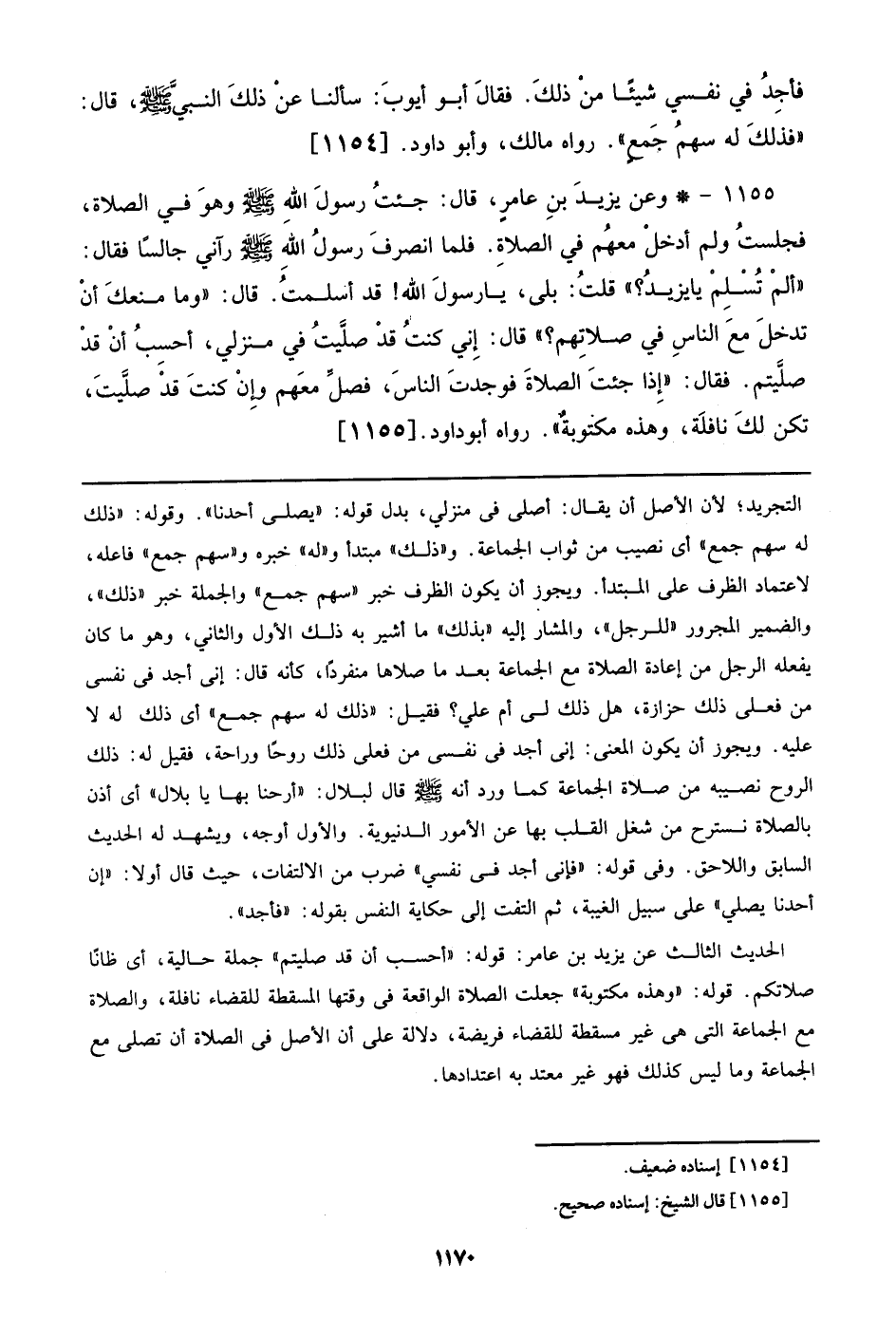 1155 - وعن يزيد بن عامر، قال: جئت رسول الله صلى الله عليه وسلم وهو في الصلاة، فجلست ولم أدخل معهم في الصلاة. فلما انصرف رسول الله صلى الله عليه وسلم رإني جالساً فقال: ((ألم تسلم يا يزيد؟)) قلت: بلي، يا رسول الله! قد أسلمت. قال: ((وما منعك أن تدخل مع الناس في صلاتهم؟)) قال: إني كنت قد صليت في منزلي، أحسب أن قد صليتم. فقال: ((إذا جئت الصلاة فوجدت الناس، فصل معهم وإن كنت قد صليت، تكن لك نافلة، وهذه مكتوبة))). رواه أبو داود. [1155]
