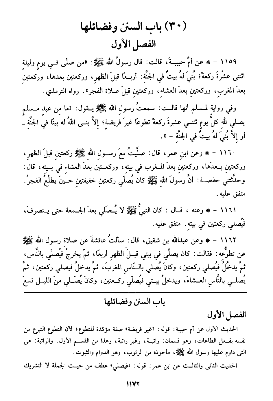 1159 - عن أم حبيبة، قالت: قال رسول الله صلى الله عليه وسلم: ((من صلي في يوم وليلة اثنتي عشرة ركعة؛ بني له بيت في الجنة: أربعاً قبل الظهر، وركعتين بعدها، وركعتين بعد المغرب، وركعتين بعد العشاء، وركعتين قبل صلاة الفجر)). رواه الترمذي.