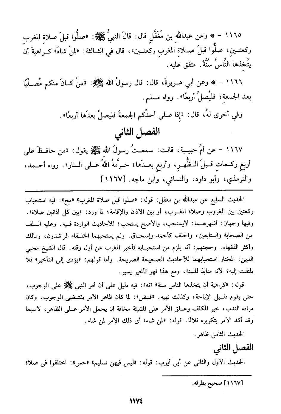 1165 - وعن عبد الله بن مغفل قال: قال النبي صلى الله عليه وسلم: ((صلوا قبل صلاة المغرب ركعتين، صلوا قبل صلاة المغرب ركعتين))، قال في الثالثة: ((لمن شاء)) كراهية أن يتخذها الناس سنة. متفق عليه.