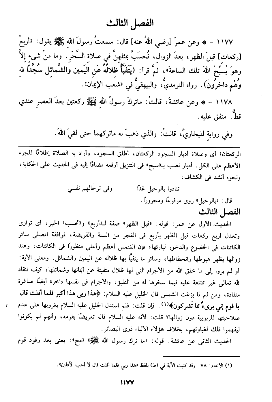 1177 - وعن عمر [رضي الله عنه] قال: سمعت رسول الله صلى الله عليه وسلم يقول: ((أربع [ركعات] قبل الظهر، بعد الزوال، تحسب بمثلهن في صلاة السحر. وما من شيء إلا وهو يسبح الله تلك الساعة))، ثم قرأ: ((يتفيأ ظلاله عن اليمين والشمائل سجداً لله وهم داخرون). رواه الترمذي، والبيهقي في ((شعب الإيمان)).