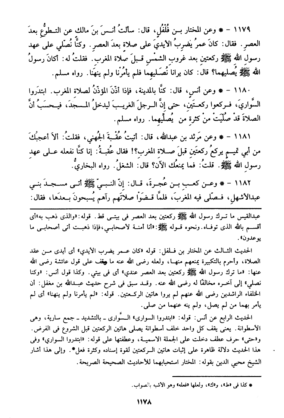 1179 - وعن المختار بن فلفل، قال: سألت أنس بن مالك عن التطوع بعد العصر. فقال: كان عمر يضرب الأيدي علي صلاة بعد العصر. وكنا نصلي علي عهد رسول الله صلى الله عليه وسلم ركعتين بعد غروب الشمس قبل صلاة المغرب. فقلت له: أكان رسول الله صلى الله عليه وسلم يصليهما؟ قال: كان يرانا نصليهما فلم يأمرنا ولم ينهنا. رواه مسلم.