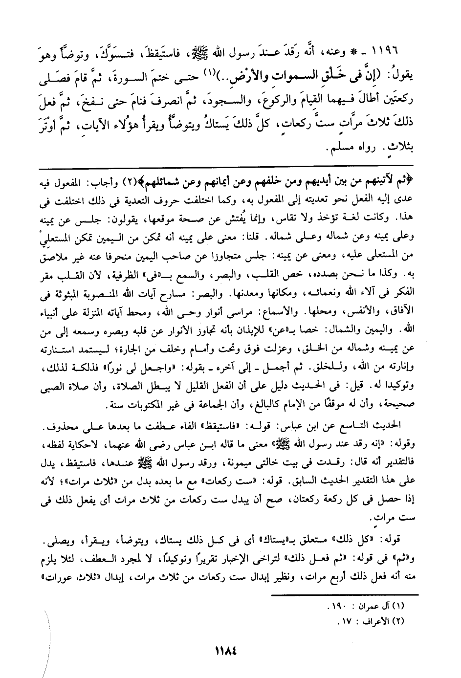 الحديث التاسع عن ابن عباس: قوله: ((فاستيقظ)) الفاء عطفت ما بعدها علي محذوف. وقوله: ((إنه رقد عند رسول الله صلى الله عليه وسلم)) معنى ما قاله ابن عباس رضي الله عنهما، لا حكاية لفظه، فالتقدير أنه قال: رقدت في بيت خالتي ميمونة، ورقد رسول الله صلى الله عليه وسلم عندها، فاستيقظ، يدل علي هذا التقدير الحديث السابق. قوله: ((ست ركعات)) مع ما بعده بدل من ((ثلاث مرات))؛ لأنه إذا حصل في كل ركعة ركعتان، صح أن يبدل ست ركعات من ثلاث مرات أي يفعل ذلك في ست مرات.