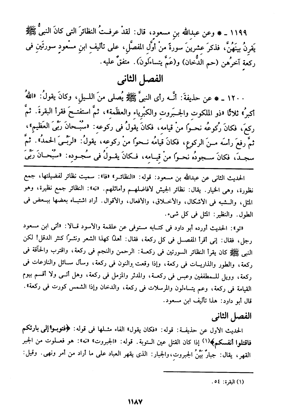 1199 - وعن عبد الله بن مسعود، قال: لقد عرفت النظائر التي كان النبي صلى الله عليه وسلم يقرن بينهن، فذكر عشرين سورة من أول المفصل، علي تأليف ابن مسعود سورتين في ركعة آخرهن (حم الدخان) و (عم يتساءلون). متفق عليه.