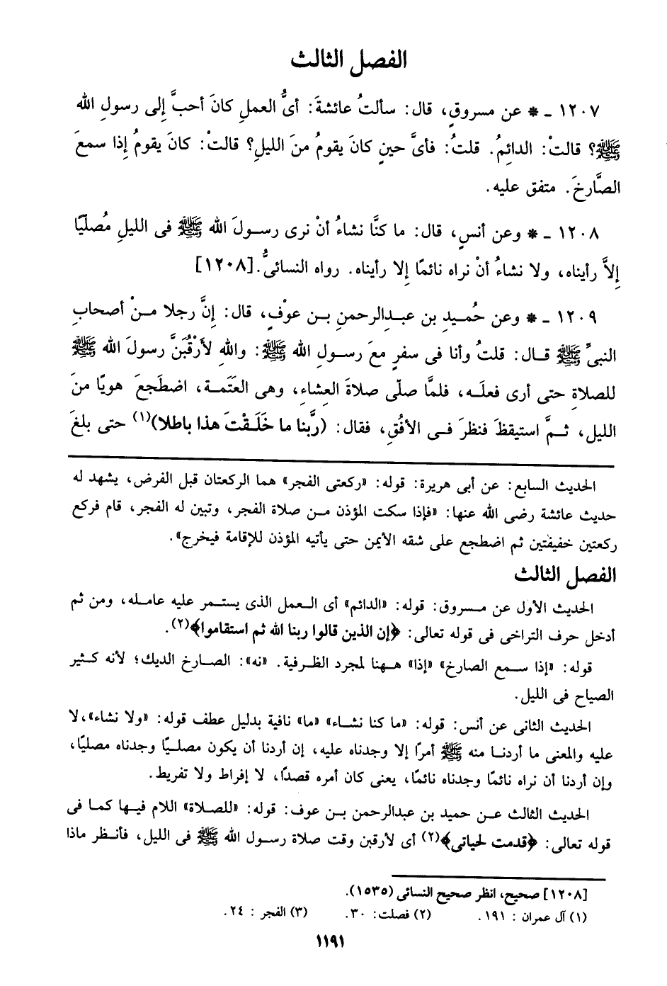 1207 - عن مسروق، قال: سألت عائشة: أي العمل كان أحب إلي رسول الله صلى الله عليه وسلم؟ قالت: الدائم. قلت: فأي حين كان يقوم من الليل؟ قالت: كان يقوم إذا سمع الصارخ. متفق عليه.