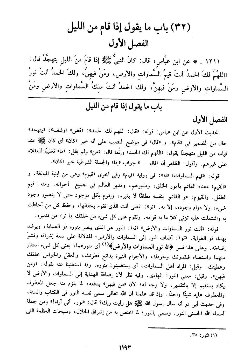 1211 - عن ابن عباس، قال: كان النبي صلى الله عليه وسلم إذا قام من الليل يتهجد قال: ((اللهم لك الحمد أنت قيم السموات والأرض، ومن فيهن، ولك الحمد أنت نور السماوات والأرض ومن فيهن، ولك الحمد أنت ملك السماوات والأرض ومن