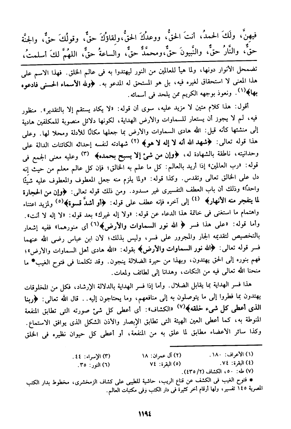 أقول: هذا كلام متين لا مزيد عليه، سوى أن قوله: ((لا يكاد يستقيم إلا بالتقدير)). منظور فيه، لم لا يجوز أن يستعار للسماوات والأرض الهداية، لكونها دلائل منصوبة للمكلفين هادية إلي منشيءها كأنه قيل: الله هادي السماوات والأرض بما جعلها مكاناً للأدلة ومحلا لها. وعلي هذا قوله تعالي: {شهد الله أنه لا إله إلا هو} شهادته لنفسه إحداثه الكائنات الدالة علي وحدإنيته، ناطقة بالشهادة له، {وإن من شيء إلا يسبح بحمد} وعليه معنى الجمع في قوله: ((رب العالمين)) إذا أريد بالعالم: كل ما علم به الخالق؛ فإن كل عالم معلم من حيث إنه دل علي الخالق تعالي وتقدس. كذا قوله: ((ولما يلزم منه جعل المعطوف والمعطوف عليه شيئاً واحداً)) وذلك أن باب العطف التفسيري غير مسدود. ومن ذلك قوله تعالي: {وإن من الحجارة لما يتفجر منه الأنهار} إلي آخره فإنه عطف علي قوله: {أو أشد قسوة} لمزيد اعتناء واهتمام ما استغنى في خاتمة هذا الدعاء عن قوله: ((ولا إله غيرك)) بعد قوله: ((لا إله لا أنت)). وأما قوله: ((علي هذا فسر {الله نور السماوات والأرض} أي منورهما)) ففيه إشعار فسر قوله تعالي: {الله نور السماوات والأرض} بقوله: ((الله هادي أهل السماوات والأرض))؛ فهم بنوره إلي الحق يهتدون، وبهذا من حيرة الضلال ينجون. وقد تكلمنا في فتوح الغيب ما منحنا الله تعالي فيه من النكات، وهدانا إلي لطائف ولمعات.