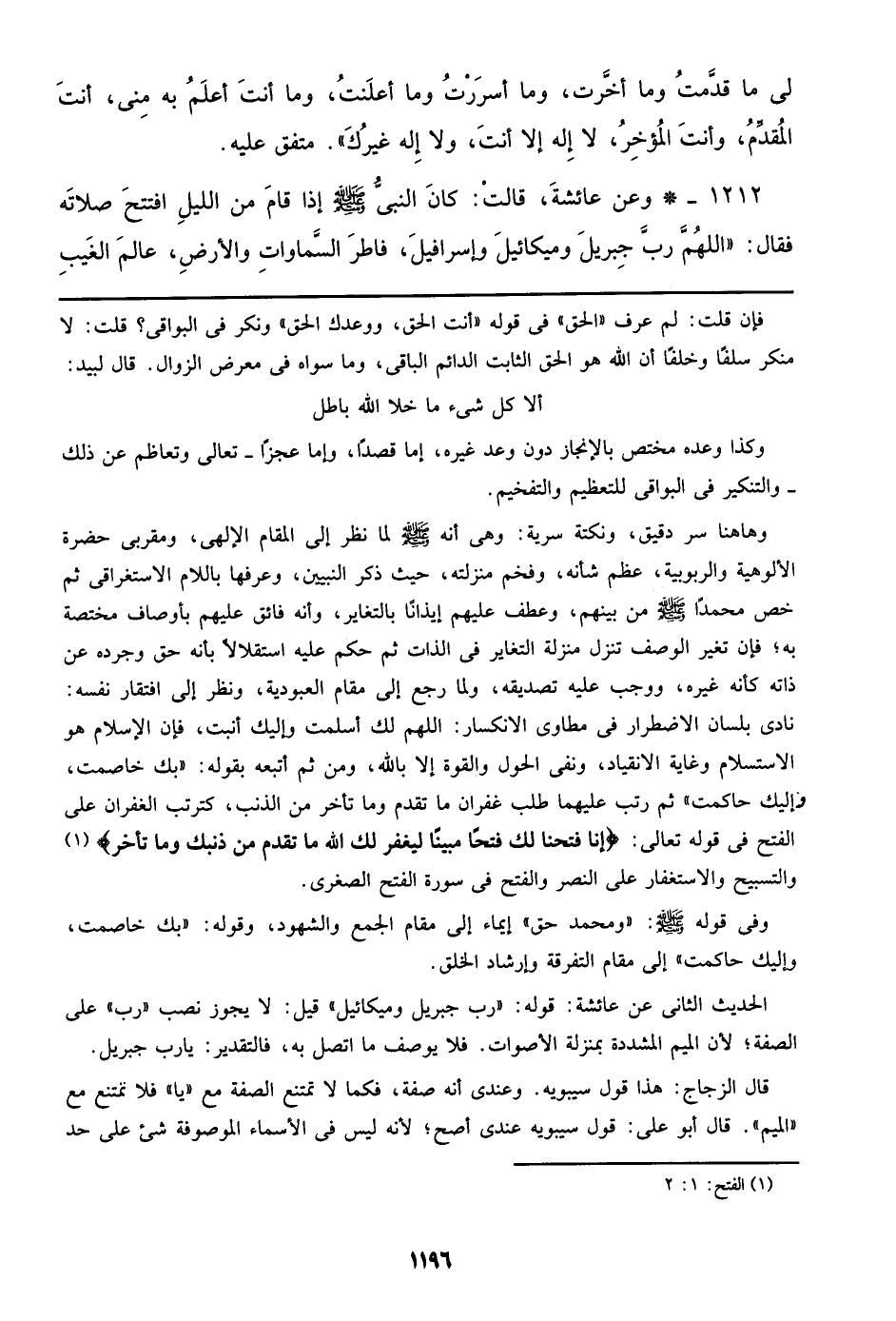 وهاهنا سر دقيق، ونكتة سرية: وهي أنه صلى الله عليه وسلم لما نظر إلي المقام الإلهي، ومقربي حضرة الألوهية والربوبية، عظم شأنه، وفخم منزلته، حيث ذكر النبيين، وعرفها باللام الاستغراقي ثم خص محمداً صلى الله عليه وسلم من بينهم، وعطف عليهم إيذاناً بالتغاير، وأنه فائق عليهم بأوصاف مختصة به، فإن تغير الوصف تنزل منزلة التغاير في الذات ثم حكم عليه استقلالاً بأنه حق وجرده عن ذاته كأنه غيره، ووجب عليه تصديقه، ولما رجع إلي مقام العبودية، ونظر إلي افتقار نفسه: نادى بلسان الاضطرار في مطاوي الانكسار: اللهم لك أسلمت وإليك أنبت، فإن الإسلام هو الاستسلام وغاية الانقياد، ونفي الحول والقوة إلا بالله، ومن ثم أتبعه بقوله: ((بك خاصمت، وإليك حاكمت) ثم رتب عليهما طلب غفران ما تقدم وما تأخر من الذنب، كترتب الغفران علي الفتح في قوله تعالي: {إنا فتحنا لك فتحاً مبينا ليغفر لك الله ما تقدم من ذنبك وما تأخر} والتسبيح والاستغفار علي النصر والفتح في سورة الفتح الصغرى.