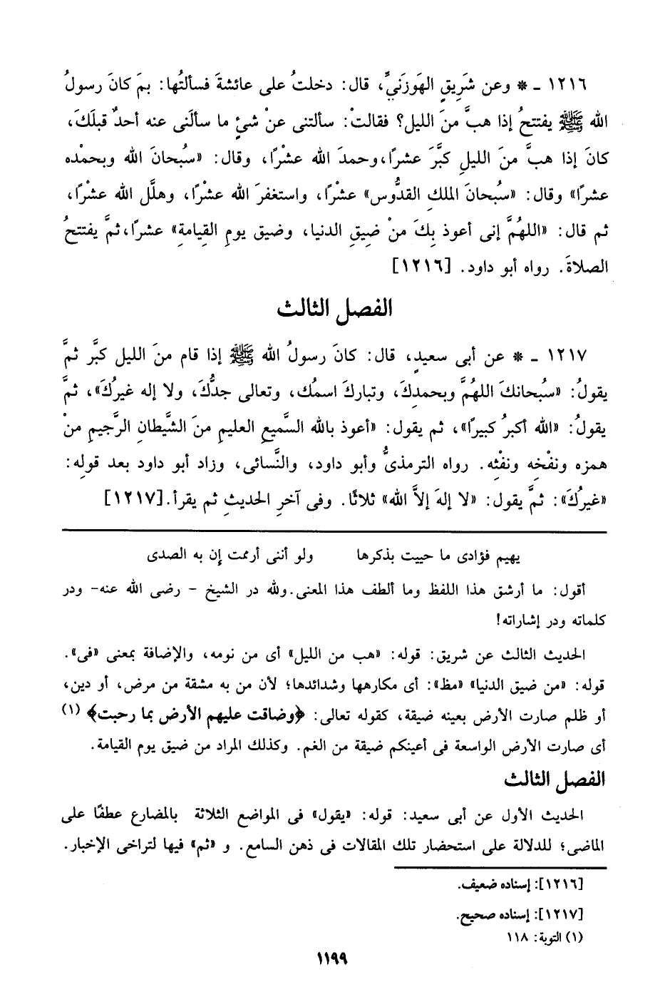 1216 - وعن شريق الهوزني، قال: دخلت علي عائشة فسألتها: بم كان رسول الله صلى الله عليه وسلم يفتتح إذا هب من الليل؟ فقالت: سألتني عن شيء ما سألني عنه أحد قبلك، كان إذا هب من الليل كبر عشراً، وحمد الله عشراً، وقال: ((سبحان الله وبحمده عشراً)) وقال: ((سبحان الملك القدوس)) عشراً، واستغفر الله عشراً، وهلل الله عشراً، ثم قال: ((اللهم إني أعوذ بك من ضيق الدنيا، وضيق يوم القيامة)) عشراً، ثم يفتتح الصلاة. رواه أبو داود. [1216]