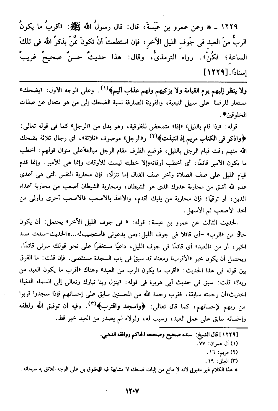 1229 - وعن عمرو بن عبسة، قال: قال رسول الله صلى الله عليه وسلم: ((أقرب ما يكون الرب من العبد في جوف الليل الآخر، فإن استطعت أن تكون ممن يذكر الله في تلك الساعة؛ فكن)). رواه الترمذي، وقال: هذا حديث حسن صحيح غريب إسناداً. [1229]