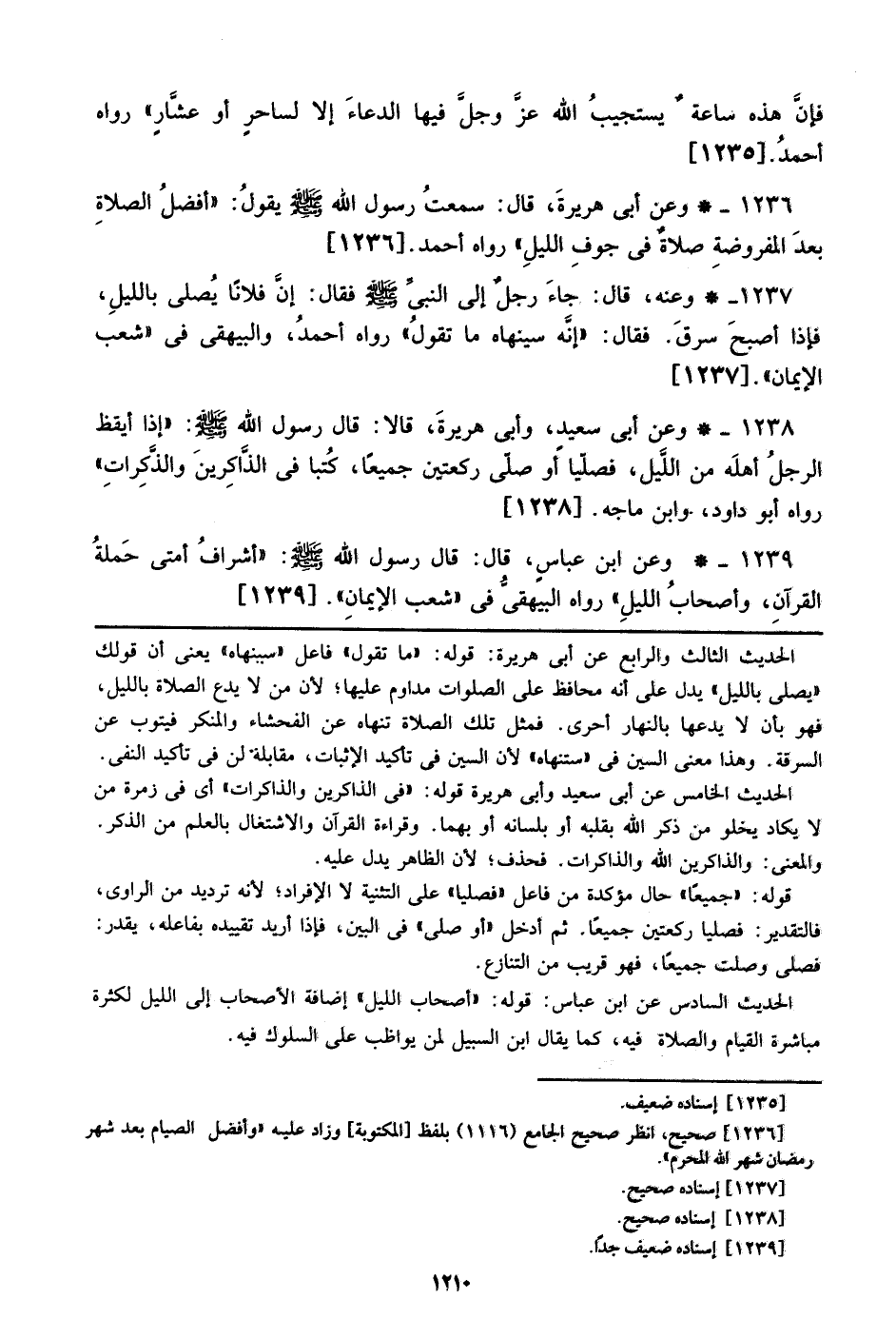 1236 - وعن أبي هريرة، قال: سمعت رسول الله صلى الله عليه وسلم يقول: ((أفضل الصلاة بعد المفروضة صلاة في جوف الليل)) رواه أحمد. [1236]