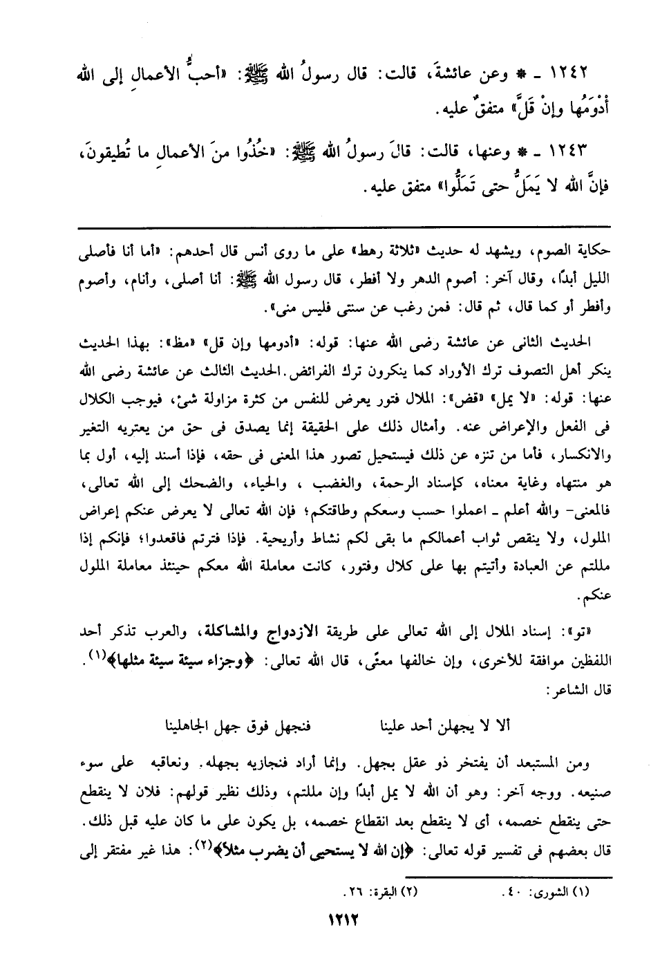 1242 - وعن عائشة، قالت: قال رسول الله صلى الله عليه وسلم: ((أحب الأعمال إلي الله أدومها وإن قل)) متفق عليه.