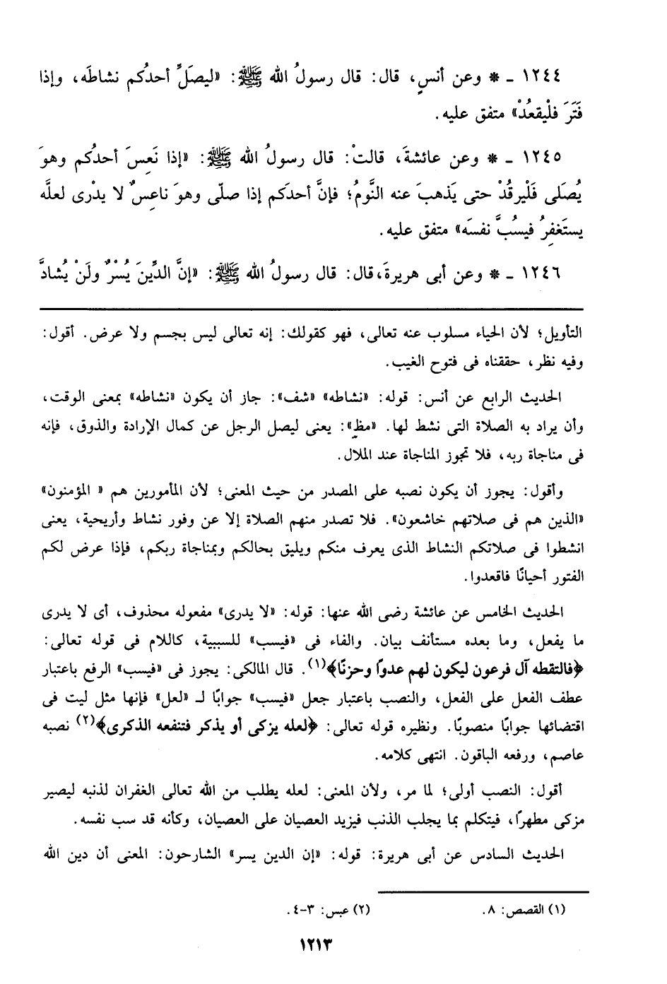 1244 - وعن أنس، قال: قال رسول الله صلى الله عليه وسلم: ((ليصل أحدكم نشاطه، وإذا فتر فليقعد)) متفق عليه.