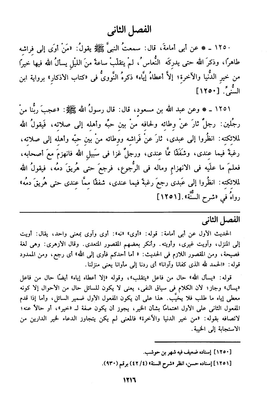 1250 - عن أبي أمامة، قال: سمعت النبي صلى الله عليه وسلم يقول: ((من أوى إلي فراشه طاهراً، وذكر الله حتى يدركه النعاس، لم يتقلب ساعة من الليل يسأل الله فيها خيراً من خير الدنيا والآخرة؛ إلا أعطاه أياه)) ذكره النووي في ((كتاب الأذكار)) برواية ابن السني. [1250]