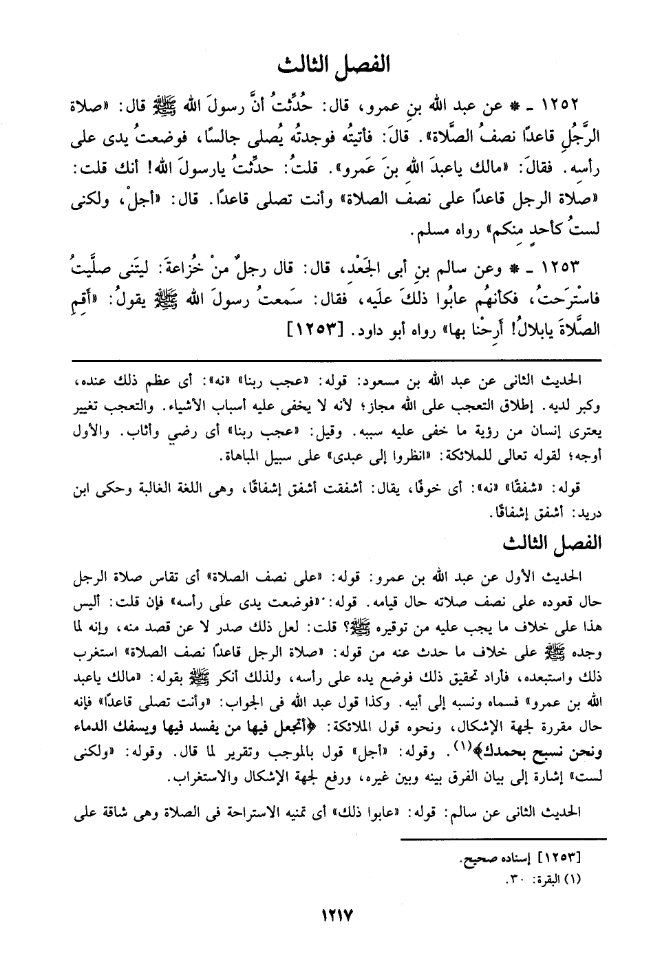 1252 - عن عبد الله بن عمرو، قال: حدثت أن رسول الله صلى الله عليه وسلم قال: ((صلاة الرجل قاعداً نصف الصلاة)). قال: فأتيته فوجدته يصلي جالساً، فوضعت يدي علي رأسه. فقال: ((مالك يا عبد الله بن عمرو)). قلت: حدثت يا رسول الله! أنك قلت: ((صلاة الرجل قاعداً علي نصف الصلاة)) وأنت تصلي قاعداً. قال: ((أجل، ولكني لست كأحد منكم)) رواه مسلم.