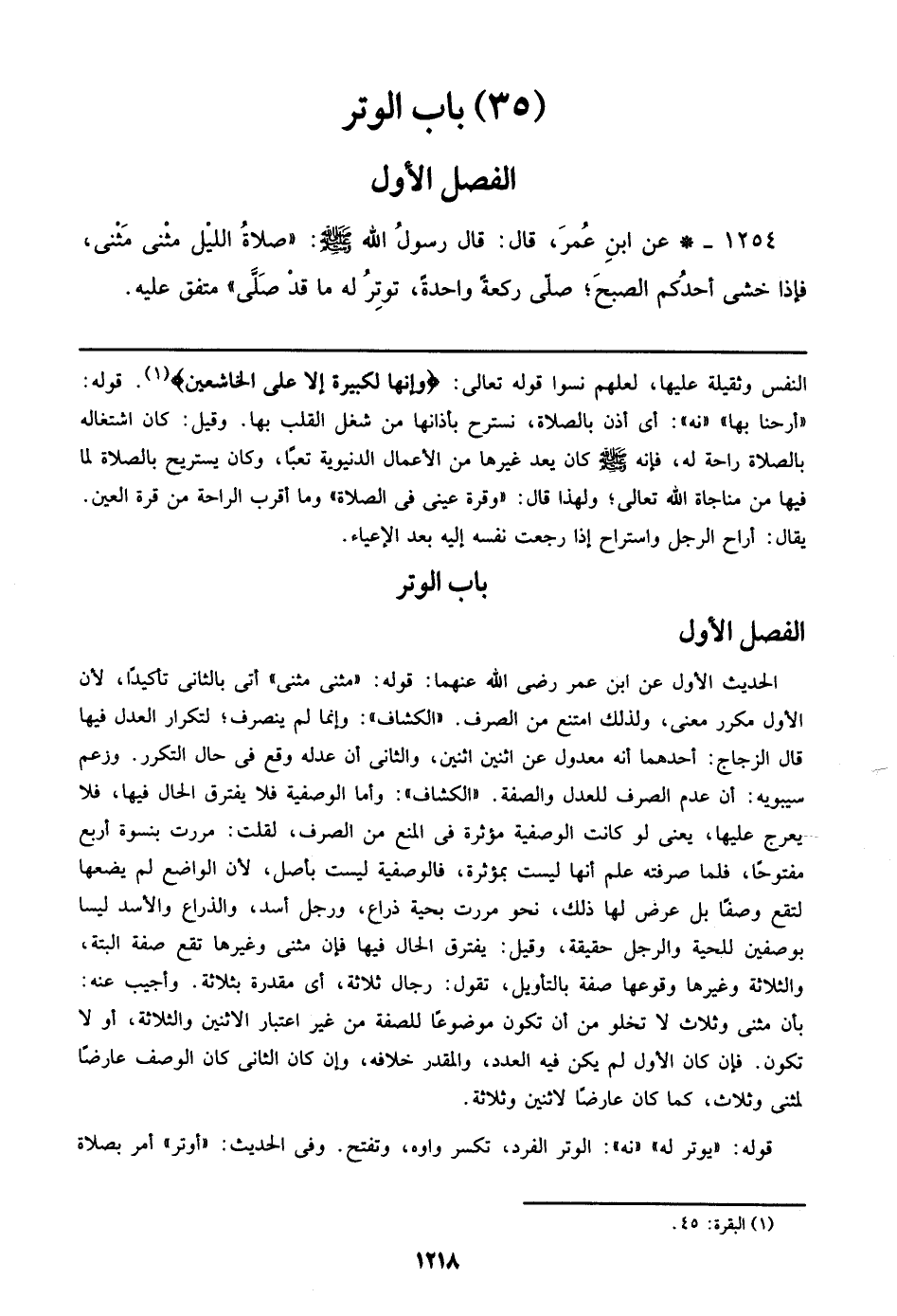 الحديث الأول عن ابن عمر رضي الله عنهما: قوله: ((مثنى مثنى)) أتى بالثاني تأكيداً، لأن الأول مكرر معنى، ولذلك امتنع من الصرف. ((الكشاف)): وإنما لم ينصر؛ لتكرار العدل فيها قال الزجاج: أحدهما أنه معدول عن اثنين اثنين، والثاني أن عدله وقع في حال التكرر. وزعم سيبويه: أن عدم الصرف للعدل والصفة. ((الكشاف)): وأما الوصفية فلا يفترق الحال فيها، فلا يعرج عليها، يعني لو كانت الوصفية مؤثرة في المنع من الصرف، لقلت: مررت بنسوة أربع مفتوحاً، فلما صرفته علم أنها ليست بمؤثرة، فالوصفية ليست بأصل، لأن الواضع لم يضعها لتقع وصفاً بل عرض لها ذلك، نحو مررت بحية ذراع، ورجل أسد، والذراع والأسد ليسا بوصفين للحية والرجل حقيقة، وقيل: يفترق الحال فيها فإن مثنى وغيرها تقع صفة البتة، والثلاثة وغيرها وقوعها صفة بالتأويل، تقول: رجال ثلاثة، أي مقدر بثلاثة. وأجيب عنه: بأن مثنى وثلاث لا تخلو من أن تكون موضوعاً للصفة من غير اعتبار الاثنين والثلاثة، أو لا تكون. فإن كان الأول لم يكن فيه العدد، والمقدر خلافه، وإن كان الثاني كان الوصف عارضاً لمثنى وثلاث، كما كان عارضاً لاثنين وثلاثة.