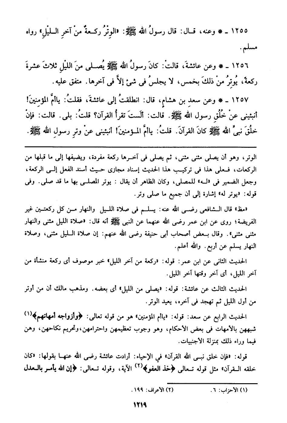 1257 - وعن سعد بن هشام، قال: انطلقت إلي عائشة، فقلت: يا أم المؤمنين! أنبئيني عن خلق رسول الله صلى الله عليه وسلم. قالت: ألست تقرأ القرآن؟ قلت: بلي. قالت: فإن خلق نبي الله صلى الله عليه وسلم كان القرآن. قلت: يا أم المؤمنين! أنبئيني عن وتر رسول الله صلى الله عليه وسلم.
