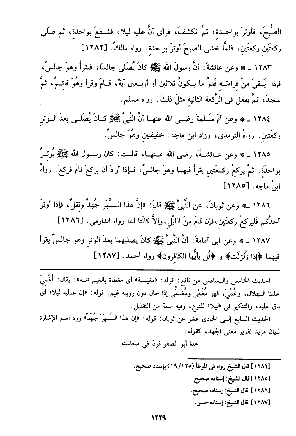 1285 - وعن عائشة، رضي الله عنها، قالت: كان رسول الله صلى الله عليه وسلم يوتر بواحدة. ثم يركع ركعتين يقرأ فيهما وهو جالس، فإذا أراد أن يركع قام فركع. رواه ابن ماجه. [1285]