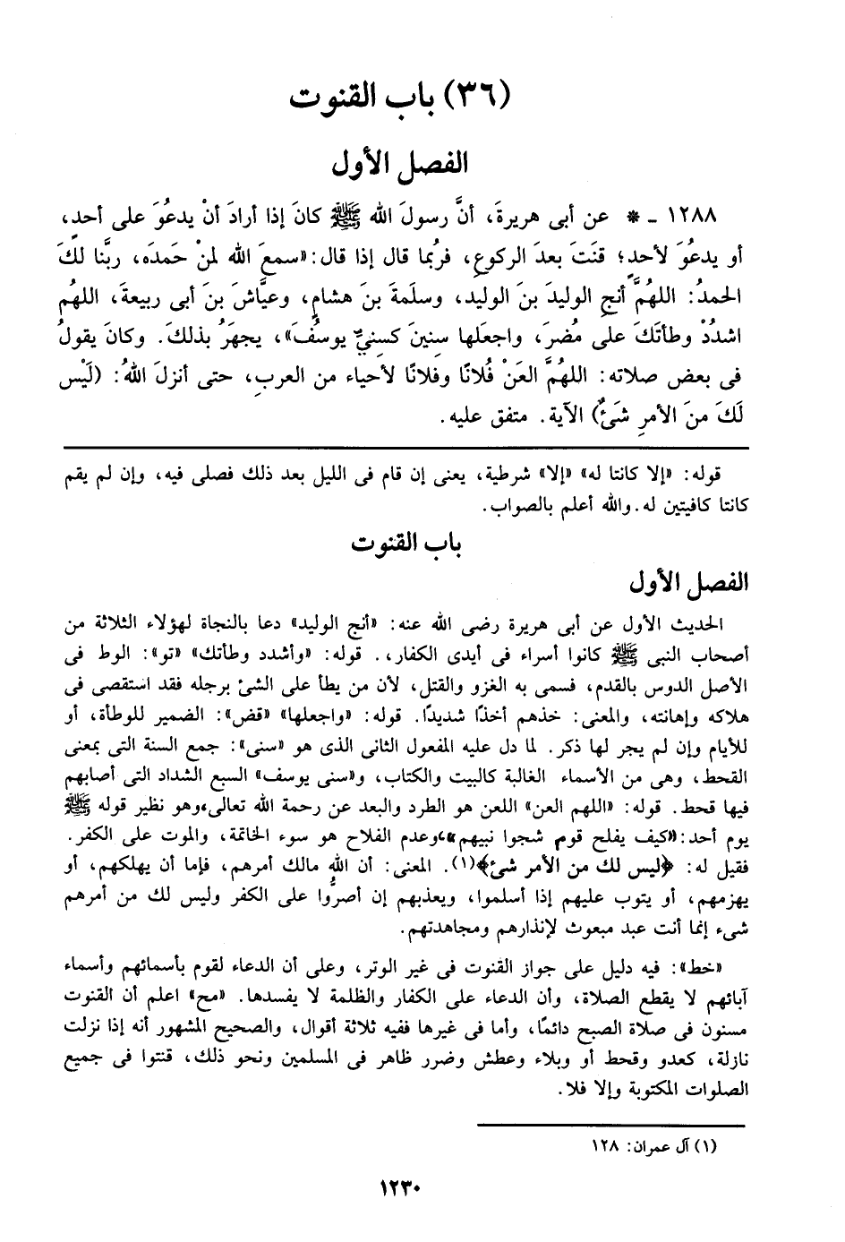 الحديث الأول عن أبي هريرة رضي الله عنه: ((أنج الوليد)) دعا بالنجاة لهؤلاء الثلاثة من أصحاب النبي صلى الله عليه وسلم كانوا أسراء في أيدي الكفار،. قوله: ((وأشدد وطأتك)) ((تو)): الوط في الأصل الدوس بالقدم، فسمي به الغزو والقتل، لأن من يطأ علي الشيء برجله فقد استقصى في هلاكه وإهانته، والمعنى أخذاً شديداً. قوله: ((واجعلها)) ((قض)): المضير للوطأة، أو للأيام وإن لم يجر لها ذكر. لما دل عليه المفعول الثاني الذي هو ((سنى)): جمع السنة التي بمعنى القحط، وهي من الأسماء الغالبة كالبيت والكتاب، و ((سنى يوسف)) السبع الشداد التي أصابهم فيها قحط. قوله: ((اللهم العن)) اللعن هو الطرد والبعد عن رحمة الله تعالي، وهو نظير قوله صلى الله عليه وسلم يوم أحد: ((كيف يفلح قوم شجوا نبيهم))، وعدم الفلاح هو سوء الخاتمة، والموت علي الكفر. فقيل له: {ليس لك من الأمر شيء}. المعنى: أن الله مالك أمرهم، فإما أن يهلكهم، أو يهزمهم، أو يتوب عليهم إذا أسلموا، ويعذبهم إن أصروا علي الكفر وليس لك من أمرهم شيء إنما أنت عبد مبعوث لإنذارهم ومجاهدتهم.