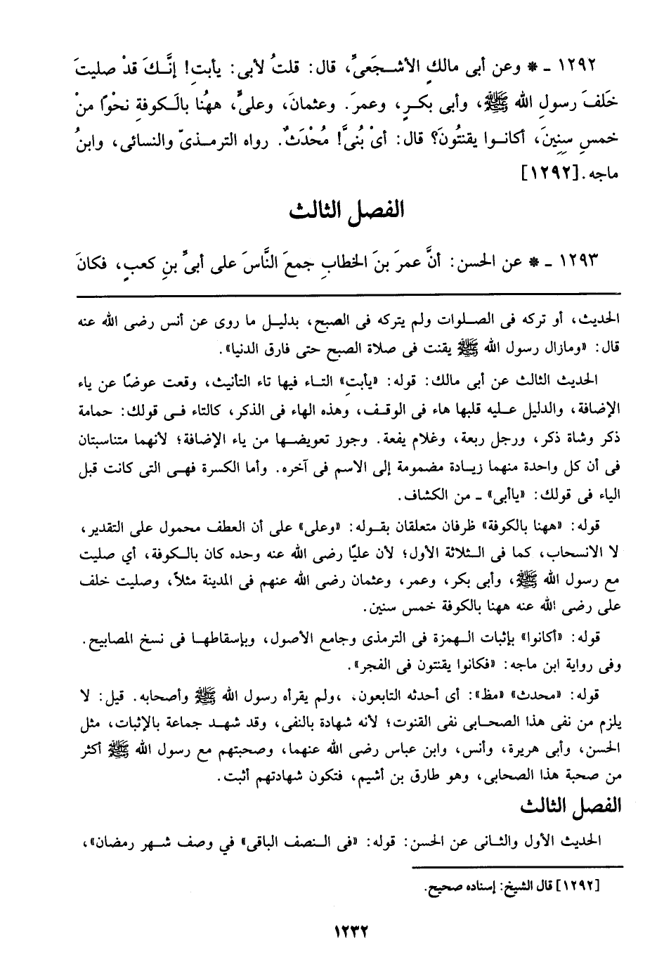 1292 - وعن أبي مالك الأشجعي، قال: قلت لأبي: يأبت! إنك قد صليت خلف رسول الله صلى الله عليه وسلم، وأبي بكر، وعمر. وعثمان، وعلي، ههنا بالكوفة نحواً من خمس سنين، أكانوا يقنتون؟ قال: أي بني! محدث. رواه الترمذي والنسائي، وابن ماجه. [1292]