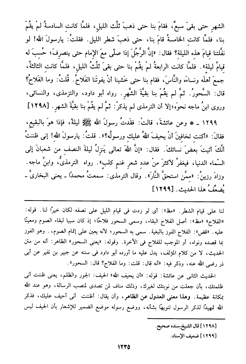 1299 - وعن عائشة، قالت: فقدت رسول الله صلى الله عليه وسلم ليلة، فإذا هو بالبقيع، فقال: ((أكنت تخافين أن يحيف الله عليك ورسوله؟)). فقلت: يا رسول الله! إني ظننت أنك أتيت بعض نسائك. فقال: ((إن الله تعالي ينزل ليلة النصف من شعبان إلي السماء الدنيا، فيغفر لأكثر من عدد شعر غنم كلب)). رواه الترمذي، وابن ماجه. وزاد رزين: ((ممن استحق النار)). قال الترمذي: سمعت محمداً- يعني البخاري- يضعف هذا الحديث. [1299]