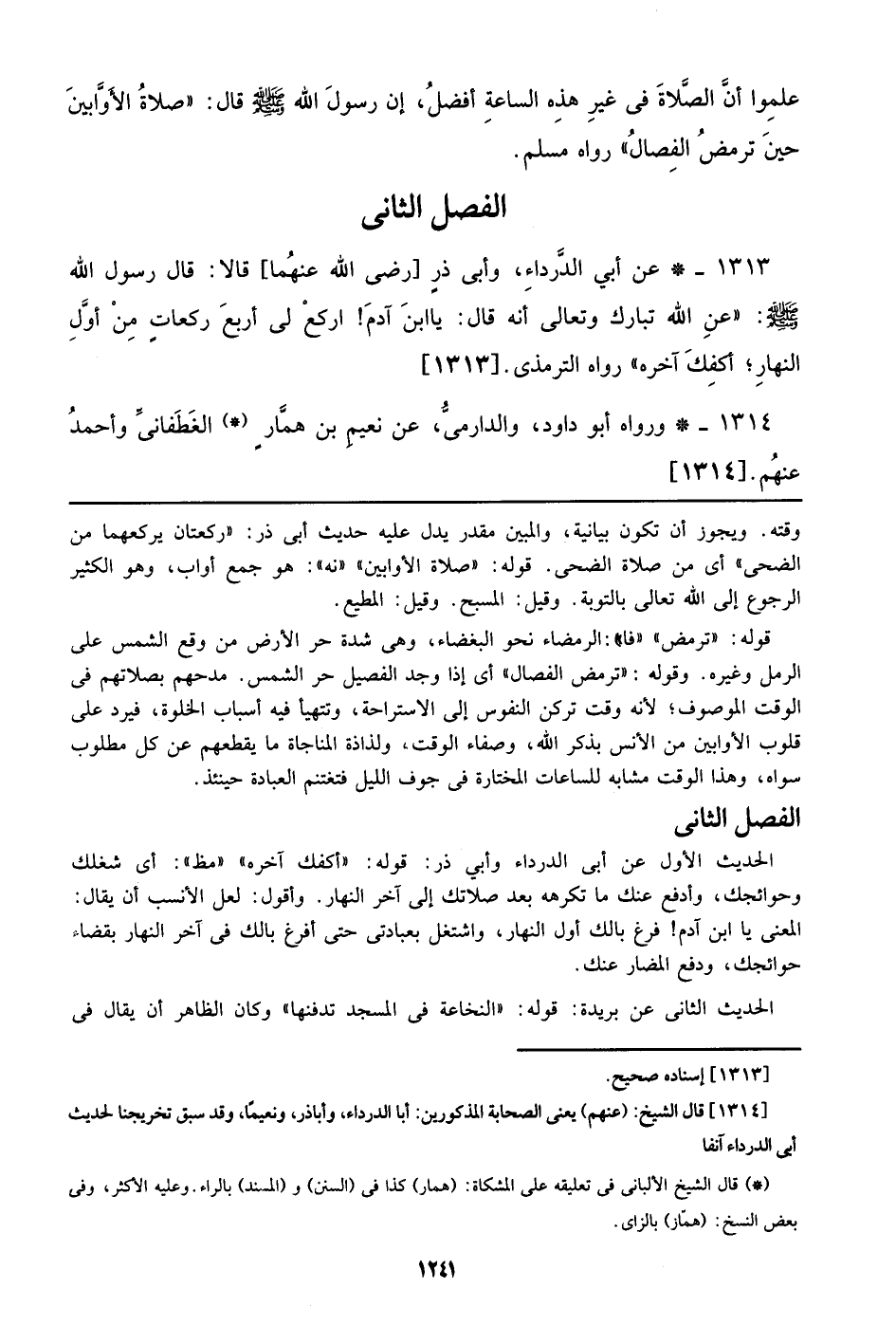 1313 - عن أبي الدرداء، وأبي ذر [رضي الله عنهما] قالا: قال رسول الله صلى الله عليه وسلم: ((عن الله تبارك وتعالي أنه قال: يا ابن آدم! اركع لي أربع ركعات من أول النهار؛ أكفك آخره)) رواه الترمذي. [1313]