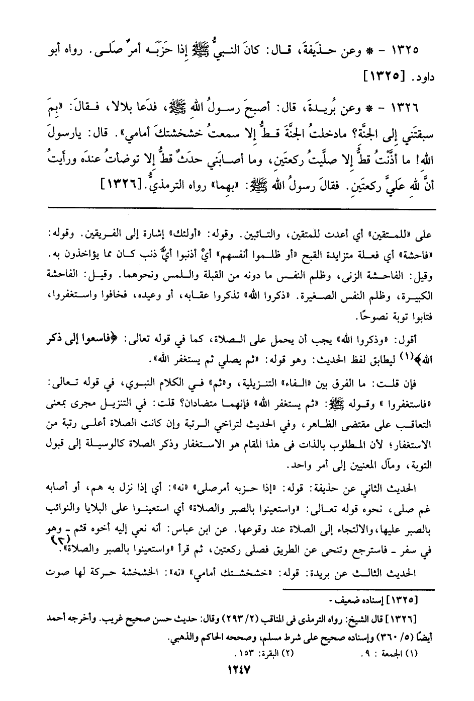 1325 - وعن حذيفة، قال: كان النبي صلى الله عليه وسلم إذا حزبه أمر صلي. رواه أبو داود. [1325]