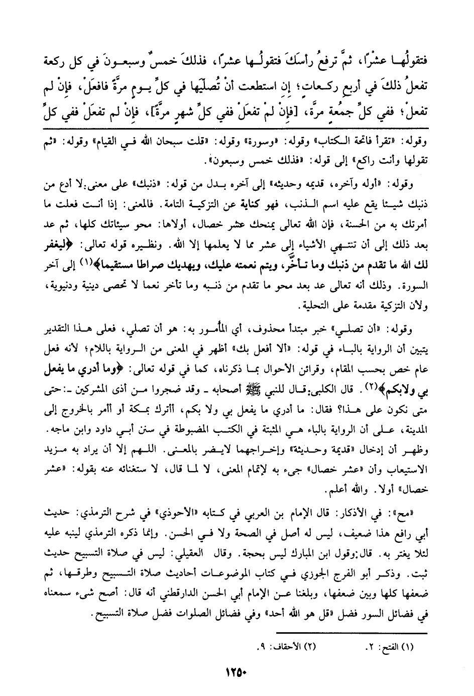 ((مح)): في الأذكار: قال الإمام بن العربي في كتابه ((الأحوذي)) في شرح الترمذي: حديث أبي رافع هذا ضعيف، ليس له أصل في الصحة ولا في الحسن. وإنما ذكره الترمذي لينبه عليه لئلا يغتر به. قال: وقول ابن المبارك ليس بحجة. وقال العقيلي: ليس في صلاة التسبيح حديث ثبت. وذكر أبو الفرج الجوزي في كتاب الموضوعات أحاديث صلاة التسبيح وطرقها، ثم ضعفها كلها وبين ضعفها، وبلغنا عن الإمام أبي الحسن الدارقطني أنه قال: أصح شيء سمعناه في فضائل السور فضل ((قل هو الله أحد)) وفي فضائل الصلوات فضل صلاة التسبيح.