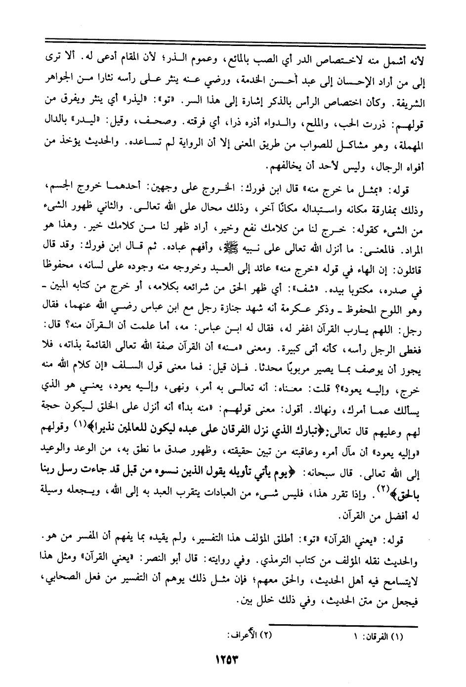 قوله: ((بمثل ما خرج منه)) قال ابن فورك: الخروج علي وجهين: أحدهما خروج الجسم، وذلك بمفارقة مكانه واستبداله مكاناً آخر، وذلك محال علي الله تعالي. والثاني ظهور الشيء من الشيء كقوله: خرج لنا من كلامك نفع وخير، أراد ظهر لنا من كلامك خير. وهذا هو المراد. فالمعنى: ما أنزل الله تعالي علي نبيه صلى الله عليه وسلم، وأفهم عباده. ثم قال ابن فورك: وقد قال قائلون: إن الهاء في قوله ((خرج منه)) عائد إلي العبد وخروجه منه وجوده علي لسانه، محفوظاً في صدره، مكتوباً بيده. ((شف)): أي ظهر الحق من شرائعه بكلامه، أو خرج من كتابه المبين- وهو اللوح المحفوظ- وذكر عكرمة أنه شهد جنازة رجل مع ابن عباس رضي الله عنهما، فقال رجل: اللهم يا رب القرآن اغفر له، فقال له ابن عباس: مه، أما علمت أن القرآن منه؟ قال: فغطى الرجل رأسه، كأنه أتى كبيرة. ومعنى ((منه)) أن القرآن صفة الله تعالي القائمة بذاته، فلا يجوز أن يوصف بما يصير مربوباً محدثاً. فإن قيل: فما معنى قول السلف ((إن كلام الله منه خرج، وإليه يعود))؟ قلت: معناه: أنه تعالي به أمر، ونهي، وإليه يعود، يعني هو الذي يسألك عما أمرك، ونهاك. أقول: معنى قولهم: ((منه أبداً)) أنه أنزل علي الخلق ليكون حجة لهم وعليهم قال تعالي: {تبارك الذي نزل الفرقان علي عبده ليكون للعالمين نذيراً} وقولهم ((وإليه يعود)) أن مآل أمره وعاقبته من تبين حقيقته، وظهور صدق ما نطق به، من الوعد والوعيد إلي الله تعالي. قال سبحانه: {يوم يأتي تأويله يقول الذين نسوه من قبل قد جاءت رسل ربنا بالحق}. وإذا تقرر هذا، فليس شيء من العبادات يتقرب العبد إلي الله، ويجعله وسيلة له أفضل من القرآن.