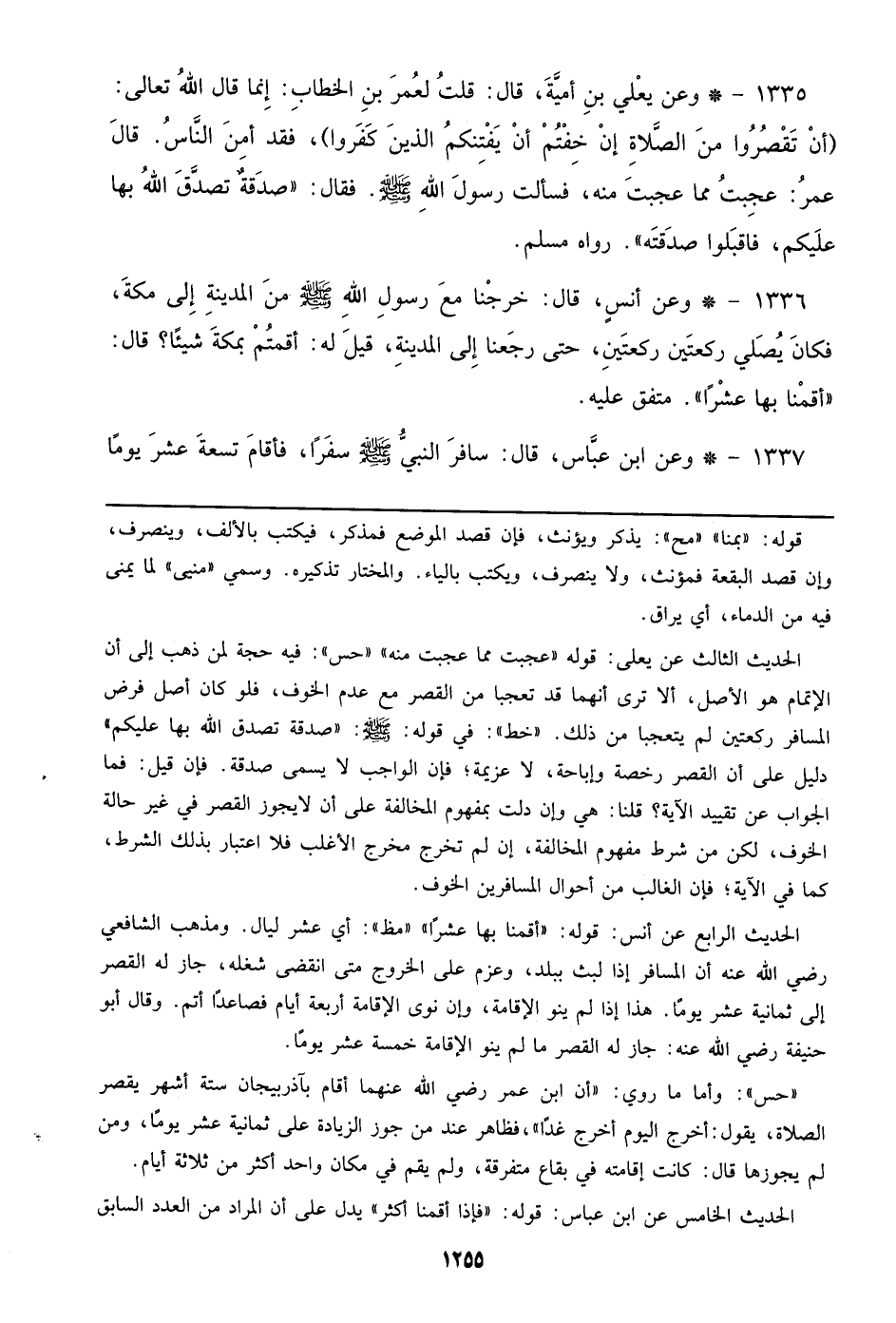 1335 - وعن يعلي بن أمية، قال: قلت لعمر بن الخطاب: إنما قال الله تعالي: (أن تقصروا من الصلاة إن خفتم أن يفتنكم الذين كفروا)، فقد أمن الناس. قال عمر: عجبت مما عجبت منه، فسألت رسول الله صلى الله عليه وسلم. فقال: ((صدقة تصدق الله بها عليكم، فاقبلوا صدقته)). رواه مسلم.