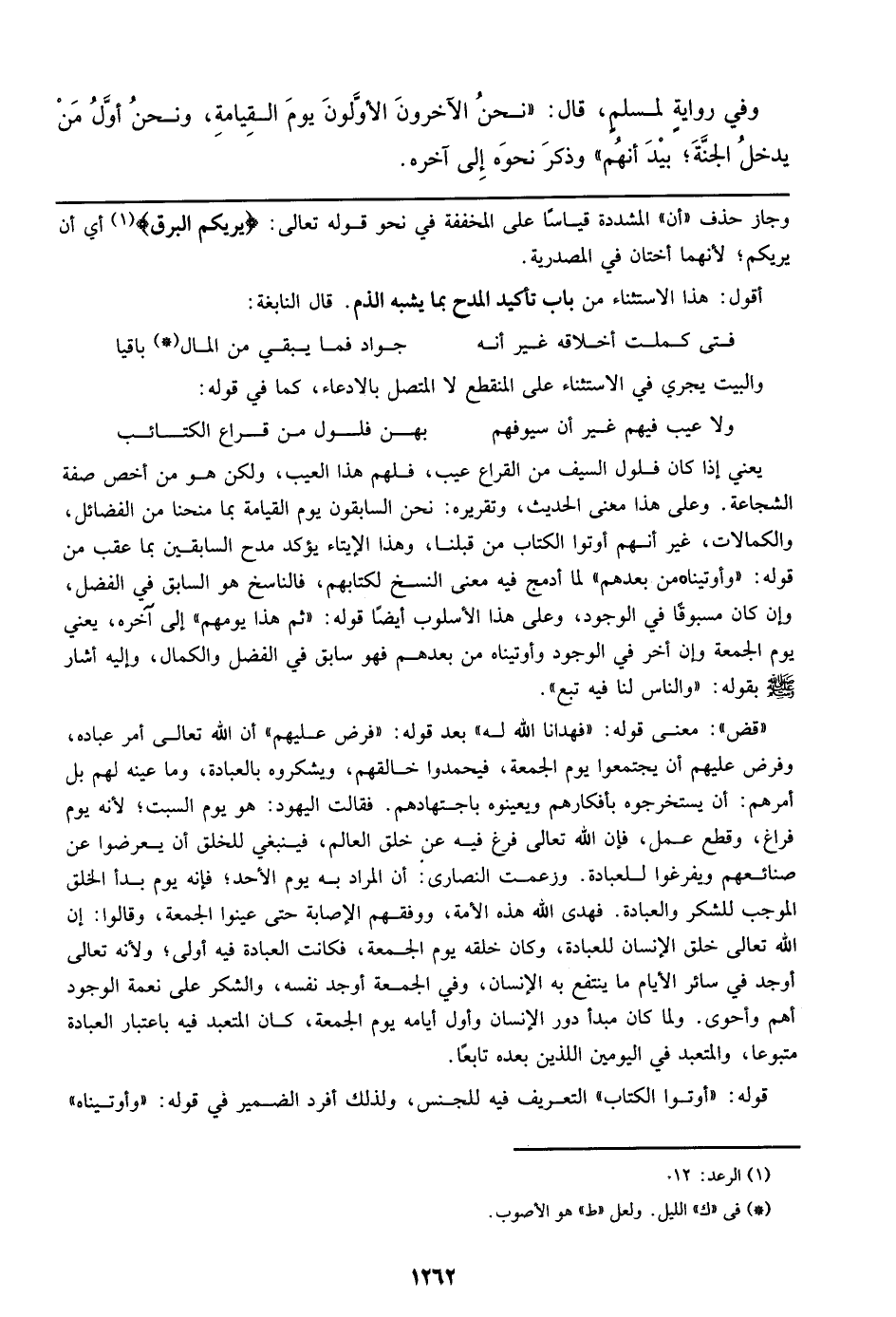 يعني إذا كان فلول السيف من القراع عيب، فلهم هذا العيب، ولكن هو من أخص صفة الشجاعة. وعلي هذا المعنى الحديث، وتقريره: نحن السابقون يوم القيامة بما منحنا من الفضائل، والكمالات، غير أنهم أوتوا الكتاب من قبلنا، وهذا الإيتاء يؤكد مدح السابقين بما عقب من قوله: ((وأوتيناه من بعدهم)) لما أدمج فيه معنى النسخ لكتابهم، فالناسخ هو السابق في الفضل، وإن كان مسبوقاً في الوجود، وعلي هذا الأسلوب أيضاً قوله: ((ثم هذا يومهم)) إلي آخره، يعني يوم الجمة وإن أخر في الوجود وأوتيناه من بعدهم فهو سابق في الفضل والكمال، وإليه أشار صلى الله عليه وسلم بقوله: ((والناس لنا فيه تبع)).