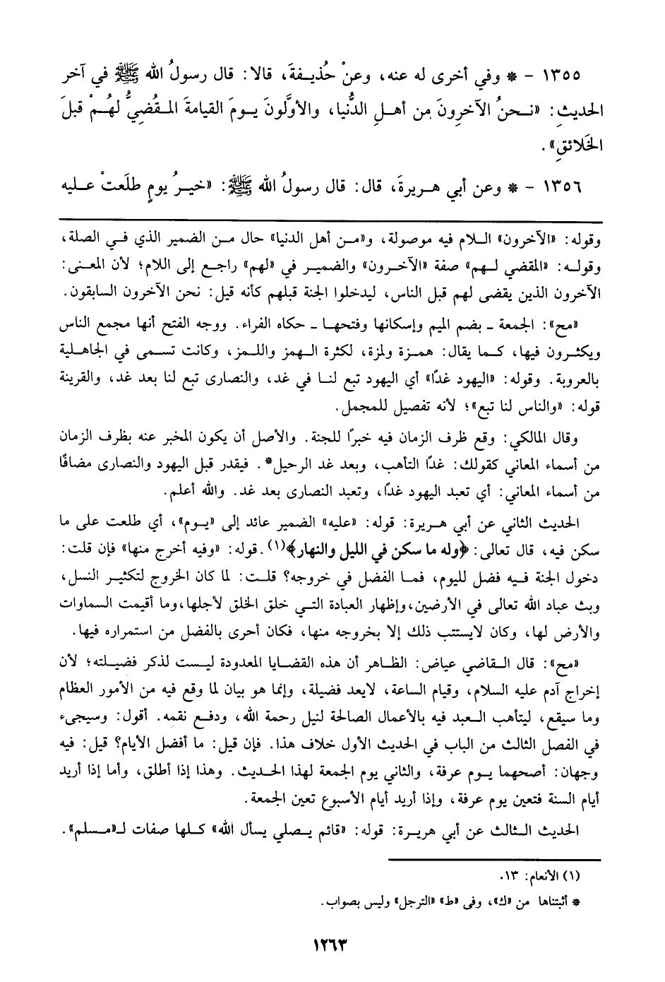 1355 - وفي أخرى له عنه، وعن حذيفة، قالا: قال رسول الله صلى الله عليه وسلم في آخر الحديث: ((نحن الآخرون من أهل الدنيا، والأولون يوم القيامة المقضي لهم قبل الخلائق)).