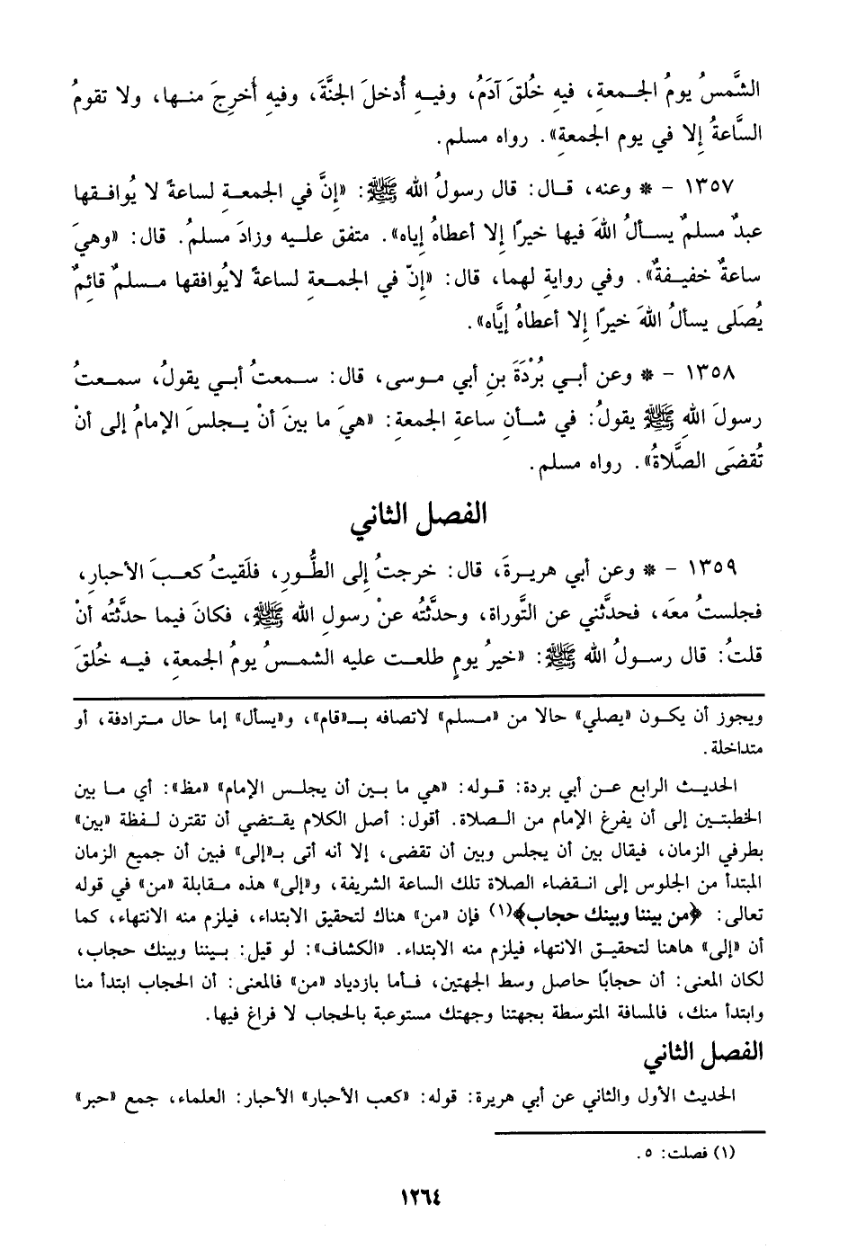 1359 - وعن أبي هريرة، قال: خرجت إلي الطور، فلقيت كعب الأحبار، فجلست معه، فحدثني عن التوراة، وحدثته عن رسول الله صلى الله عليه وسلم، فكان فيما حدثته أن قلت: قال رسول الله صلى الله عليه وسلم: ((خير يوم طلعت عليه الشمس يوم الجمعة، فيه خلق