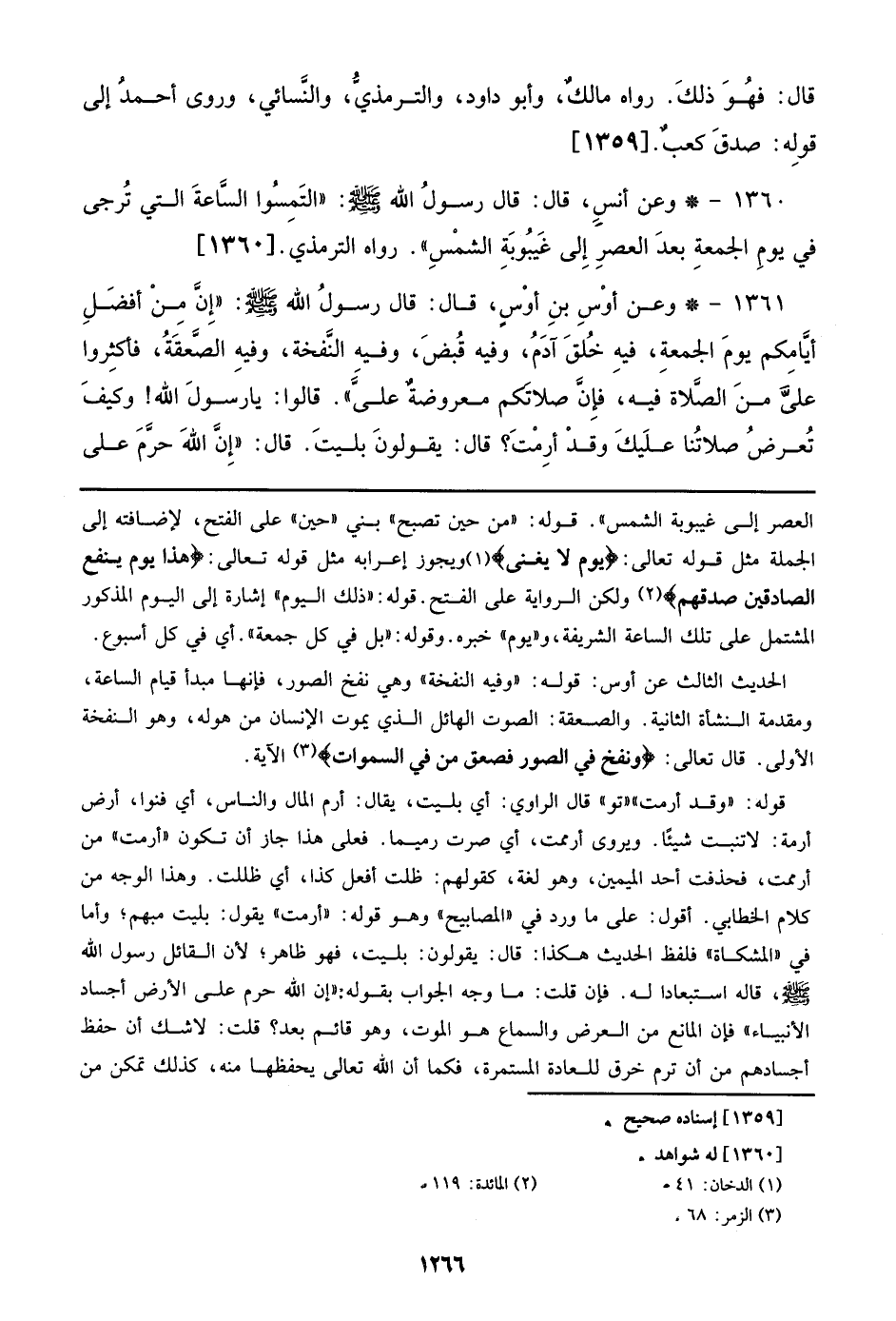 1361 - وعن أوس بن أوس، قال: قال رسول الله صلى الله عليه وسلم: ((إن من أفضل أيامكم يوم الجمعة، فيه خلق آدم، وفيه قبض، وفيه النفخة، وفيه الصعقة، فأكثروا علي من الصلاة فيه، فإن صلاتكم معروضة علي)). قالوا: يا رسول الله! وكيف تعرض صلاتنا عليك وقد أرمت؟ قال: يقولون بليت. قال: ((إن الله حرم علي