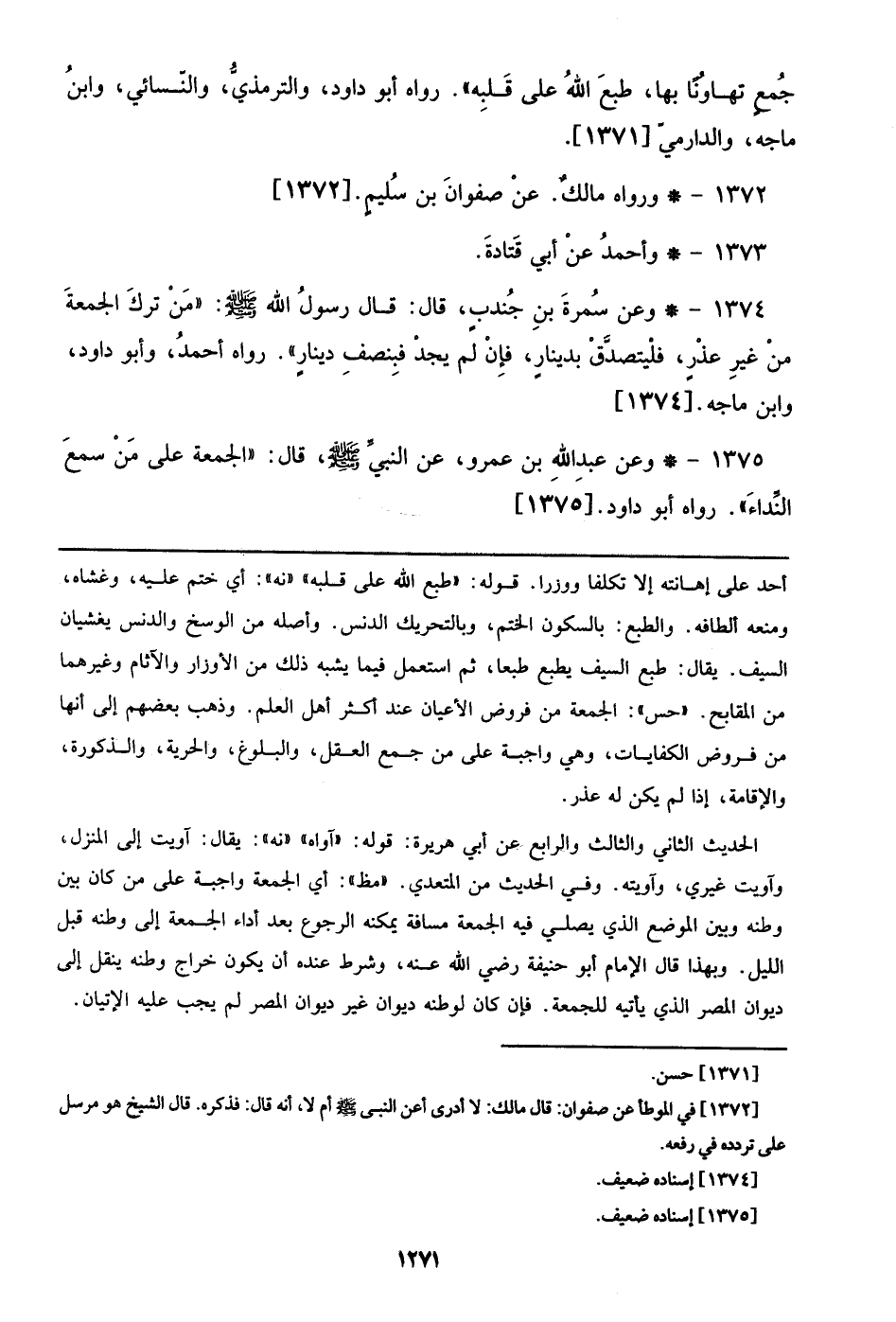 جمع تهاونا بها، طبع الله علي قلبه)). رواه أبو داود، والترمذي، والنسائي، وابن ماجه، والدارمي [1371]