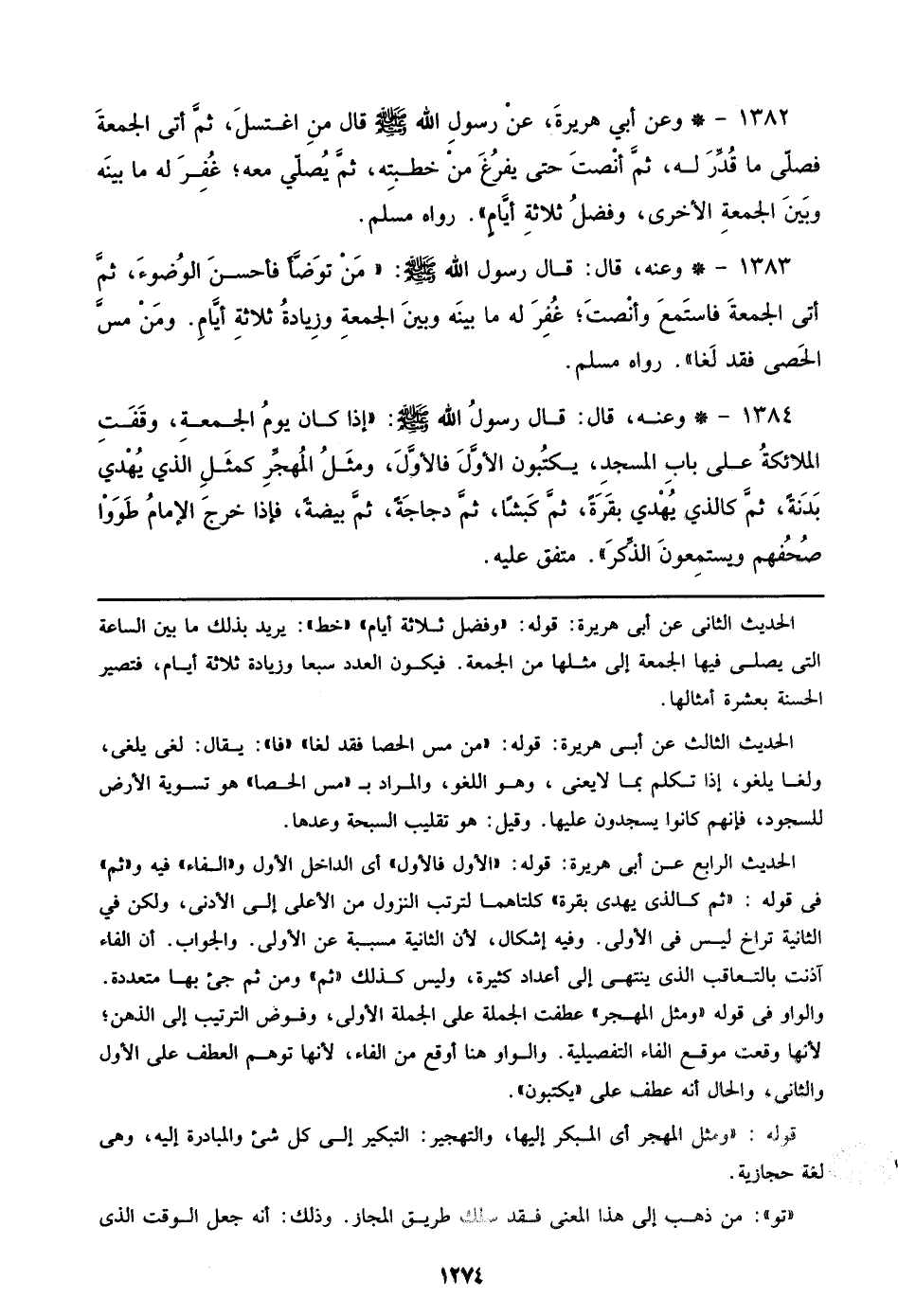 1382 - وعن أبي هريرة، عن رسول الله صلى الله عليه وسلم قال من اغتسل، ثم أتى الجمعة فصلي ما قدر له، ثم أنصت حتى يفرغ من خطبته، ثم يصلي معه؛ غفر له ما بينه وبين الجمعة الأخرى، وفضل ثلاثة أيام)). رواه مسلم.