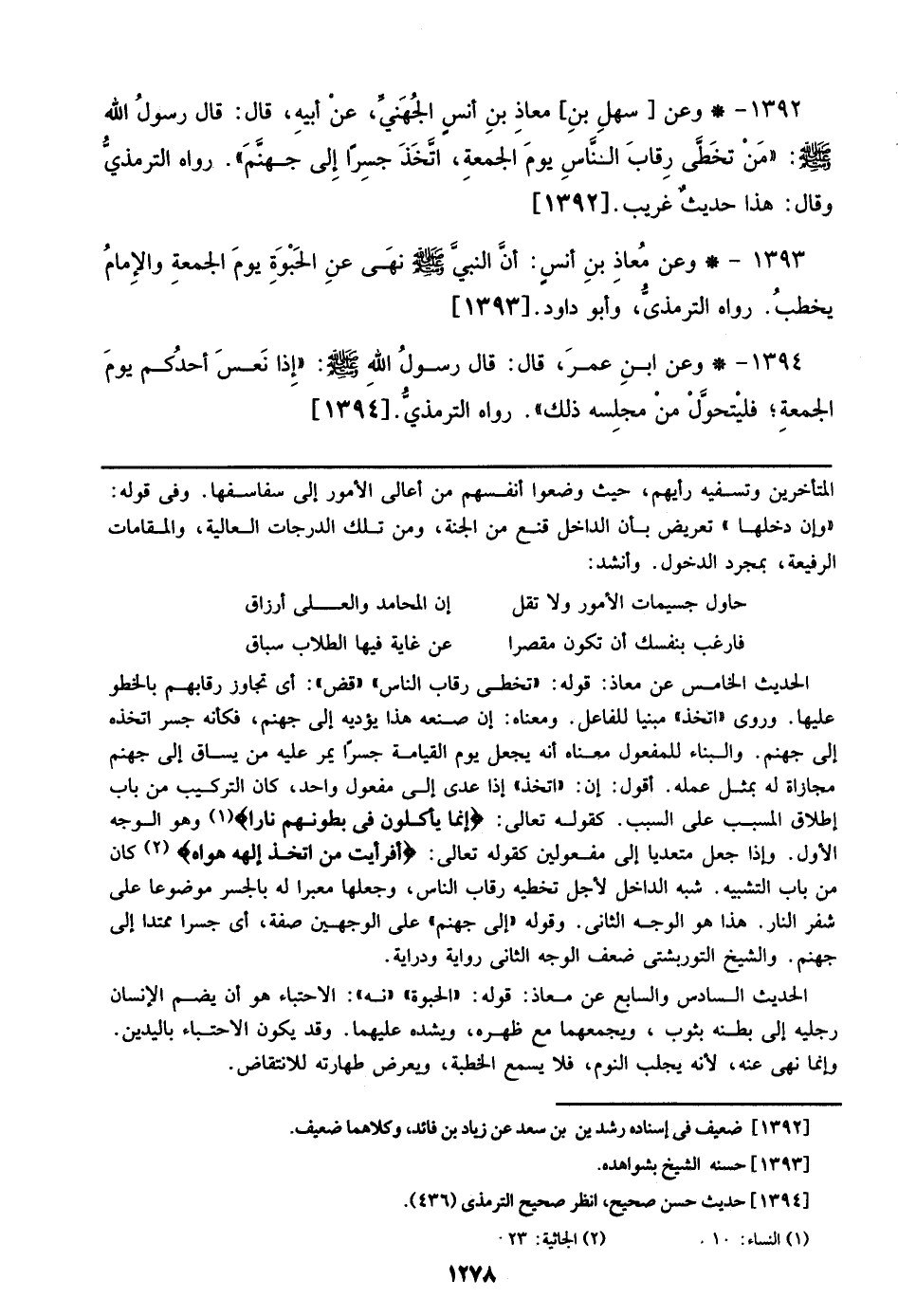 1392 - وعن [سهل بن] معاذ بن أنس الجهني، عن أبيه، قال: قال رسول الله صلى الله عليه وسلم: ((من تخطى رقاب الناس يوم الجمعة، اتخذ جسراً إلي جهنم)). رواه الترمذي وقال: هذا حديث غريب. [1392]