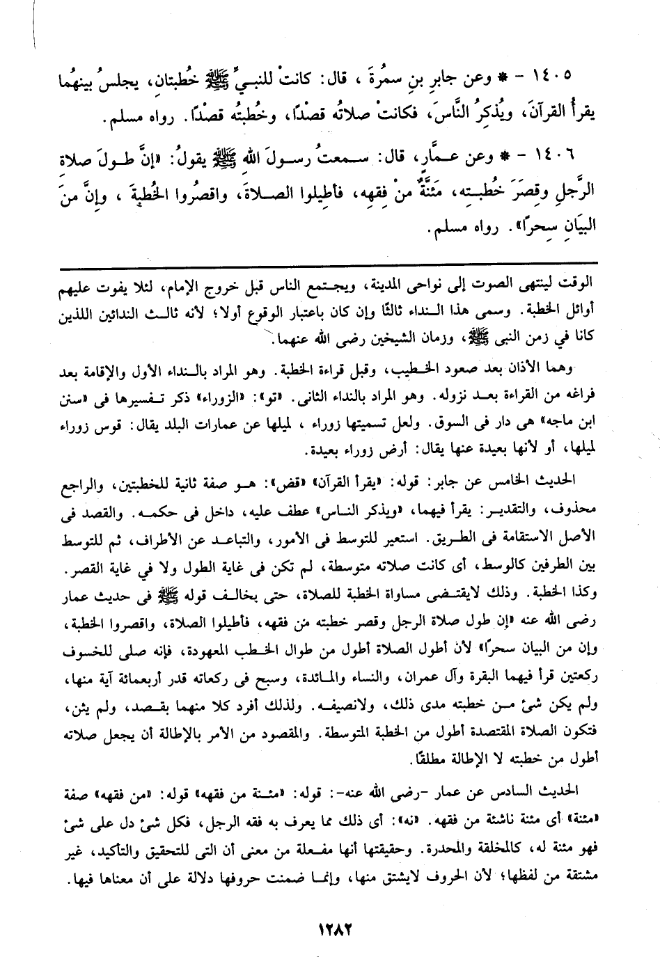 1406 - وعن عمار، قال: سمعت رسول الله صلى الله عليه وسلم يقول: ((إن طول صلاة الرجل وقصر خطبته، مئنة من فقهه، فأطيلوا الصلاة، واقصروا الخطبة، وإن من البيان سحراً)). رواه مسلم.