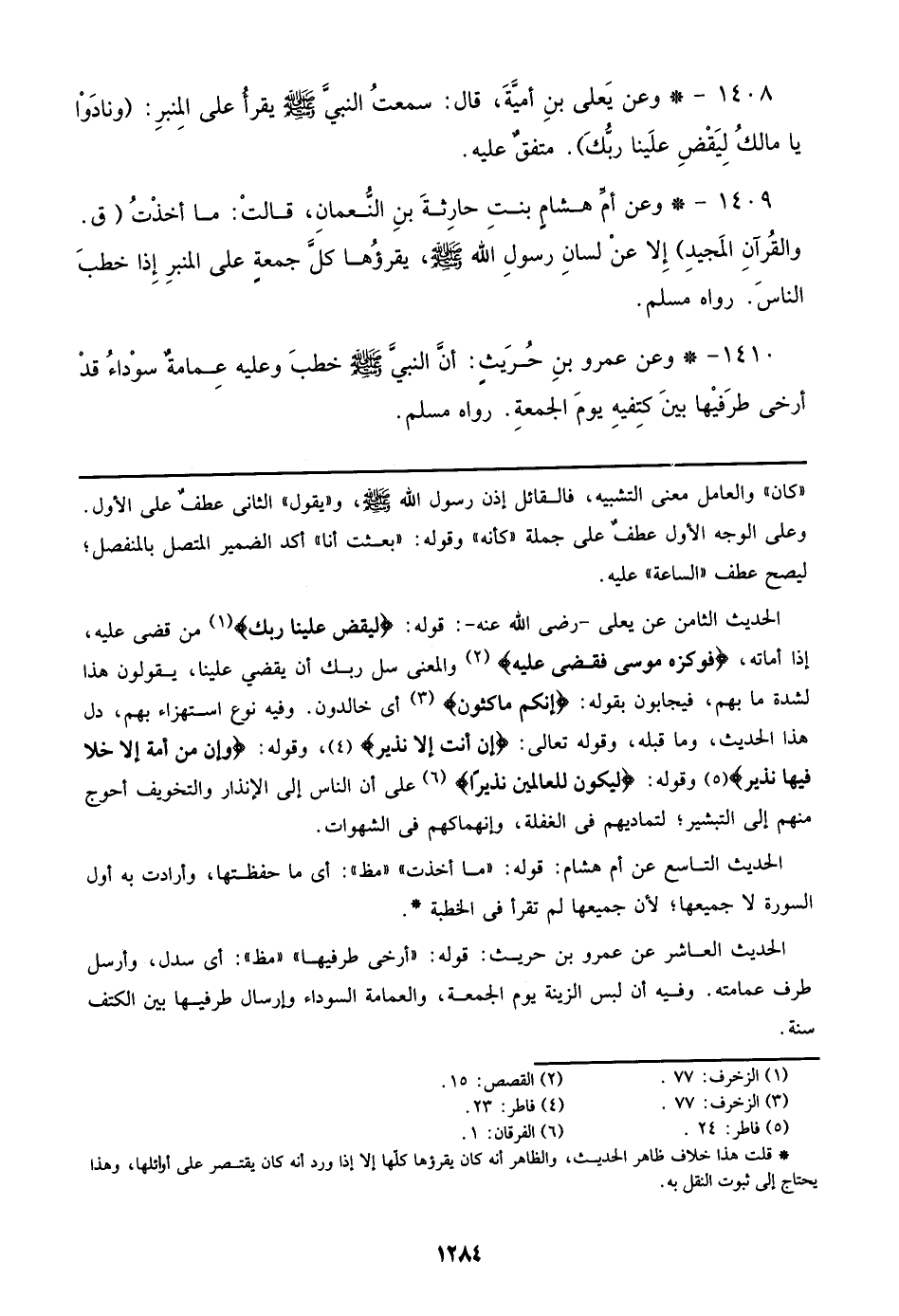 1408 - وعن يعلي بن أمية، قال: سمعت النبي صلى الله عليه وسلم يقرأ علي المنبر: (ونادوا يا مالك ليقض عيلنا ربك)). متفق عليه.