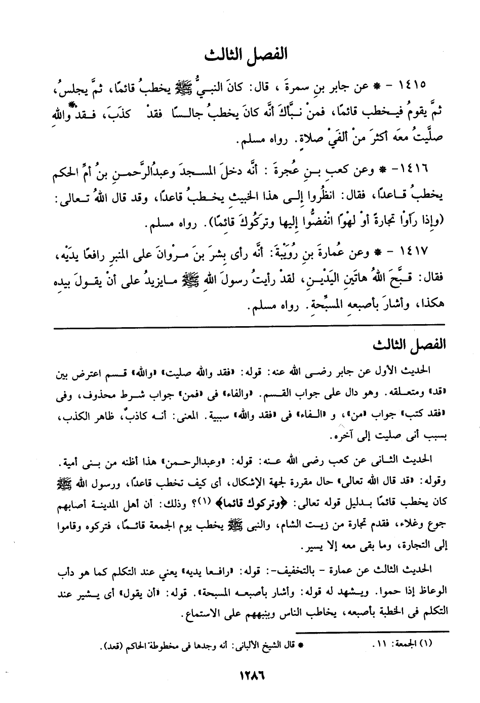 1416 - وعن كعب بن عجرة: أنه دخل المسجد وعبد الرحمن بن أم الحكم يخطب قاعداً، فقال: انظروا إلي هذا الخبيث يخطب قاعداً، وقد قال الله تعالي: (وإذا رأوا تجارة أو لهواً انفضوا إليها وتركوك قائماً). رواه مسلم.