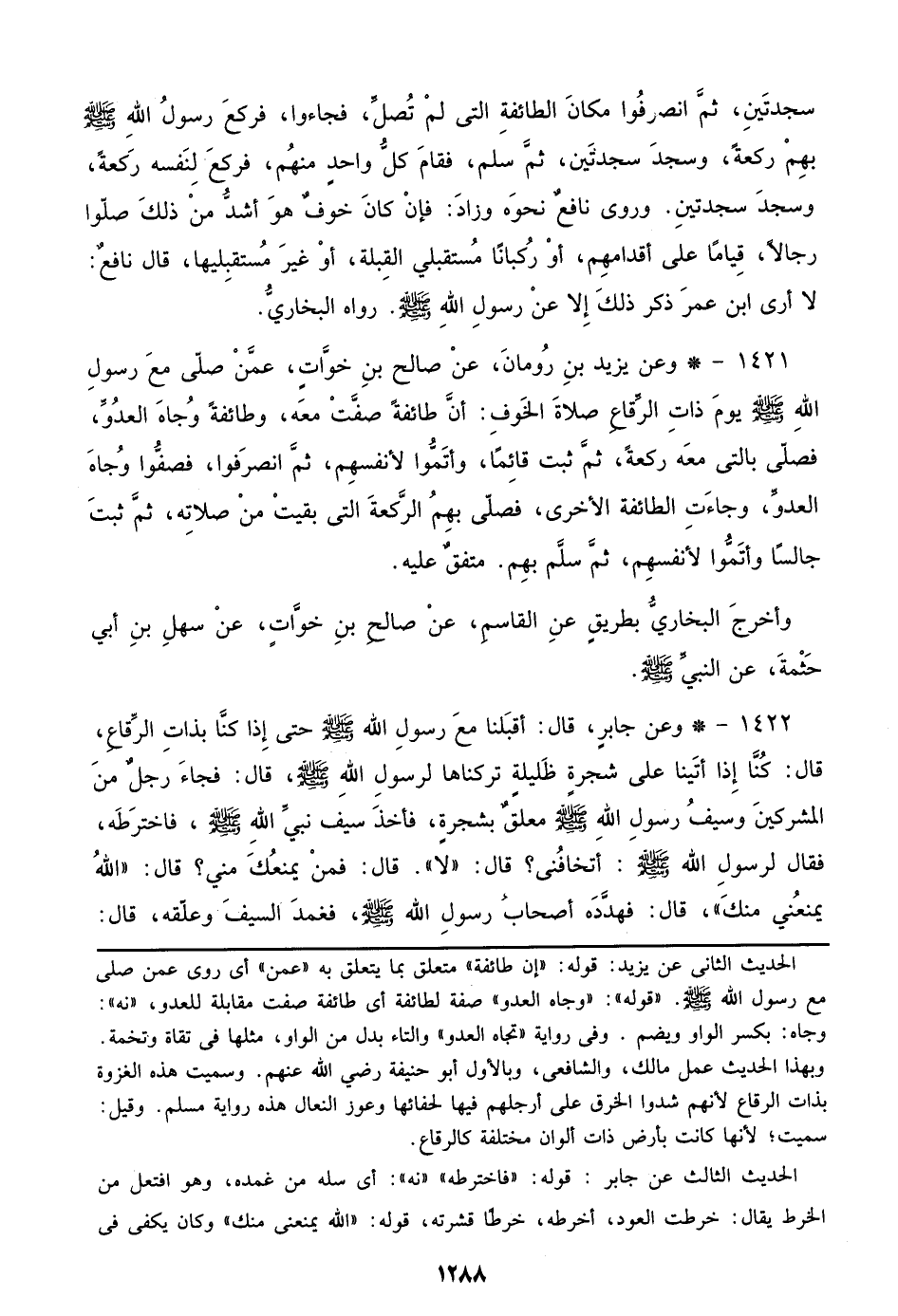 1421 - وعن يزيد بن رومان، عن صالح بن خوات، عمن صلي مع رسول الله صلى الله عليه وسلم يوم ذات الرقاع صلاة الخوف: أن طائفة صفت معه، وطائفة وجاه العدو، فصلي بالتي معه ركعة، ثم ثبت قائماً، وأتموا لأنفسهم، ثم انصرفوا، فصفوا وجاه العدو، وجاءت الطائفة الأخرى، فصلي بهم الركعة التي بقيت من صلاته، ثم ثبت جالساً وأتموا لأنفسهم، ثم سلم بهم. متفق عليه.