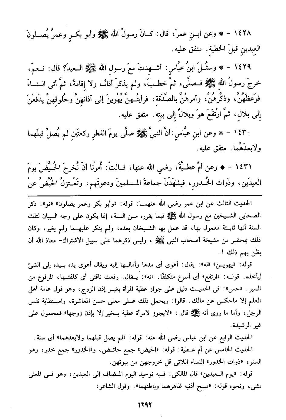 1430 - وعن ابن عباس: أن النبي صلى الله عليه وسلم صلي يوم الفطر ركعتين لم يصل قبلهما ولا بعدهما. متفق عليه.