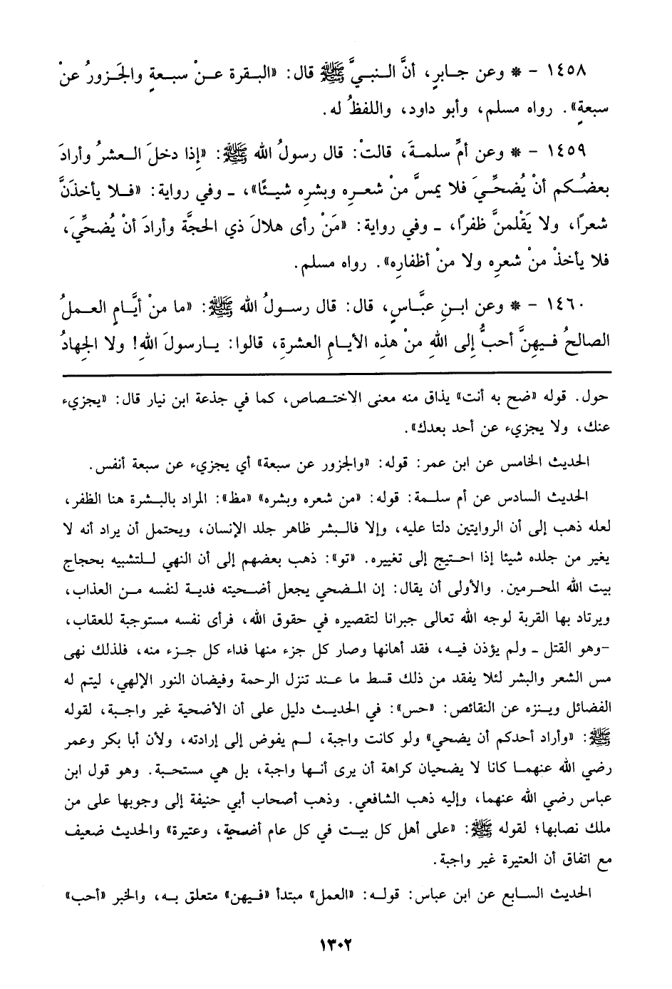 1459 - وعن أم سلمة، قالت: قال رسول الله صلى الله عليه وسلم: ((إذا دخل العشر وأراد بعضكم أن يضحي فلا يمس من شعره وبشره شيئًا))، - وفي رواية: ((فلا يأخذن شعرًا، ولا يقلمن ظفرًا، - وفي رواية: ((من رأي هلال ذي الحجة وأراد أن يضحي، فلا يأخذ من شعره ولا من أظفاره)). رواه مسلم.