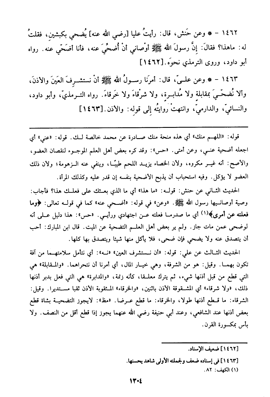 1463 - وعن علي، قال: أمرنا رسول الله صلى الله عليه وسلم أن نستشرف العين والأذن، وألا نضحي بمقابلة ولا مدابرة، ولا شرقاء ولا خرقاء، رواه الترمذي، وأبو داود، والنسائي، والدارمي، وانتهت روايته إلي قوله: والأذن. [1463]